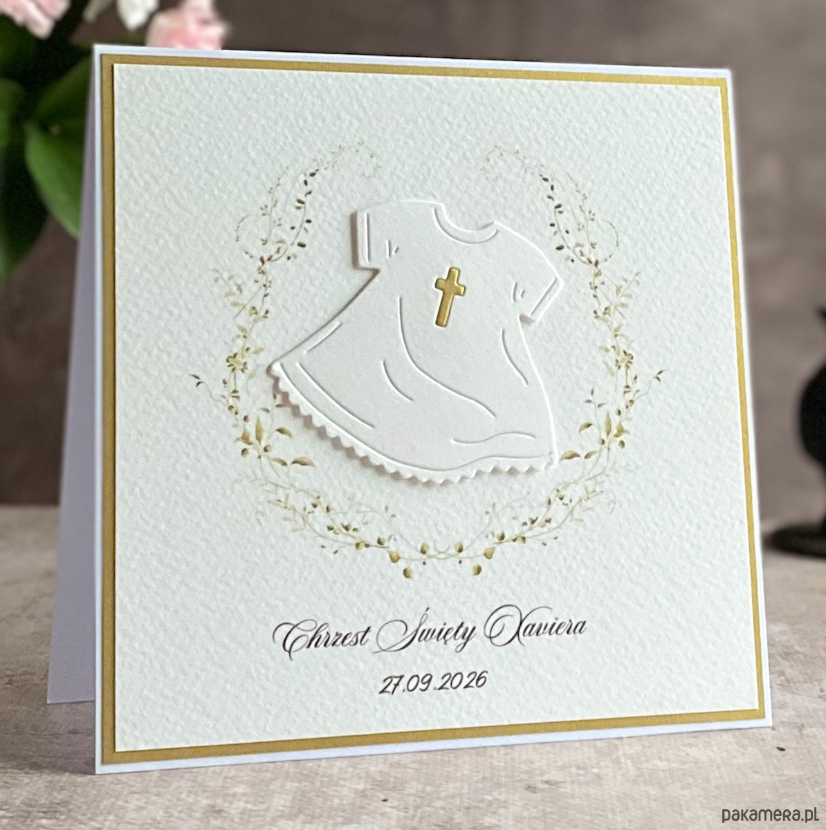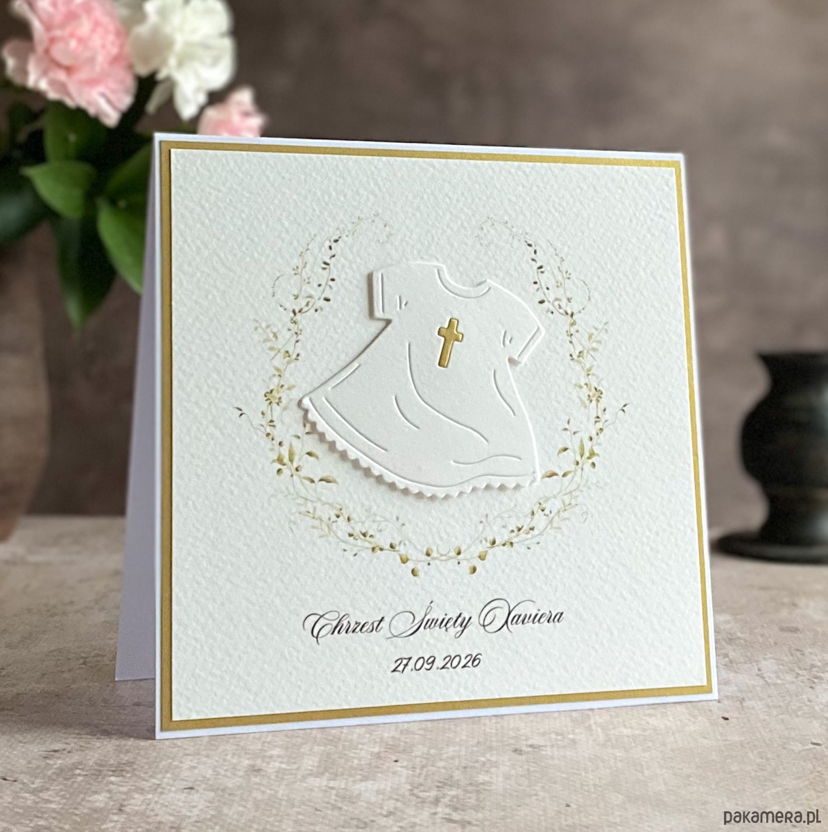 Elegancka, ręcznie wykonana, personalizowana pamiątka chrztu, kartka w pudełku z ozdobną kopertą.