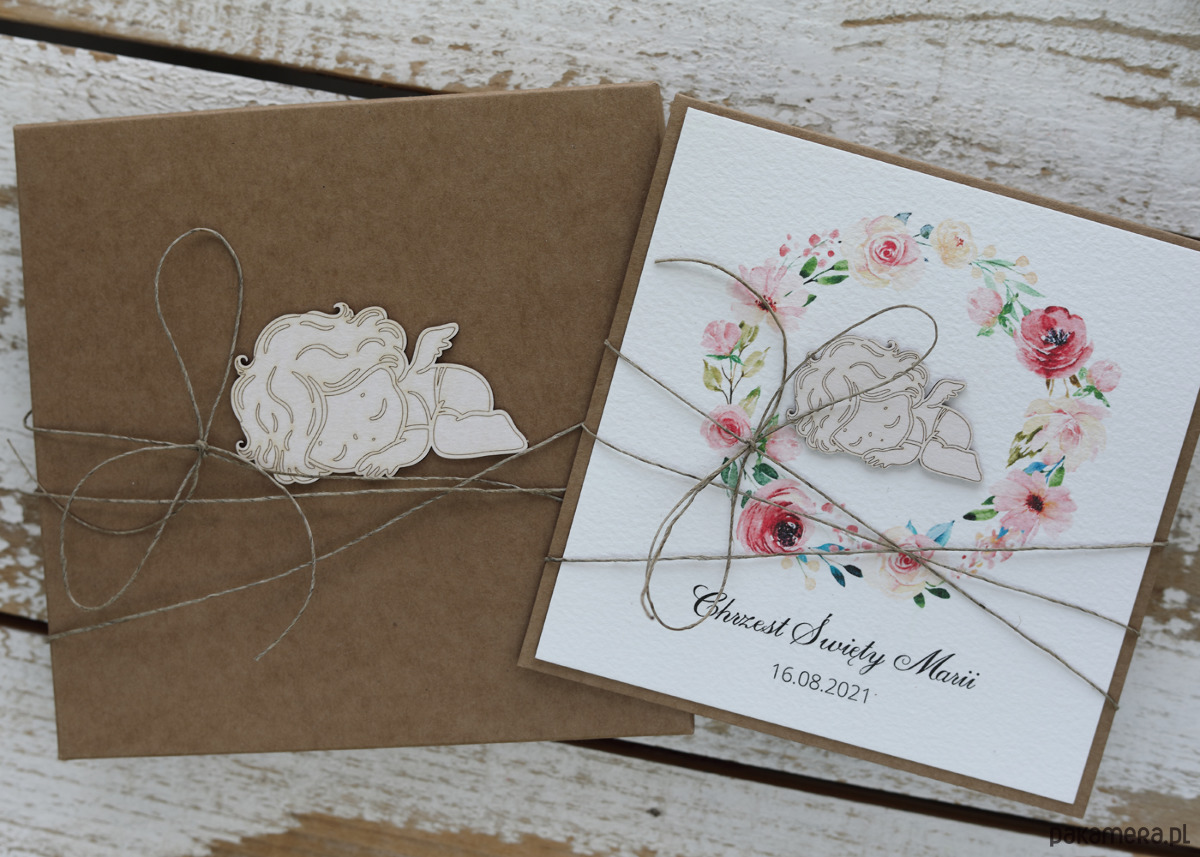 Przedmiotem oferty jest rustykalna kartka na chrzest z pudełkiem.