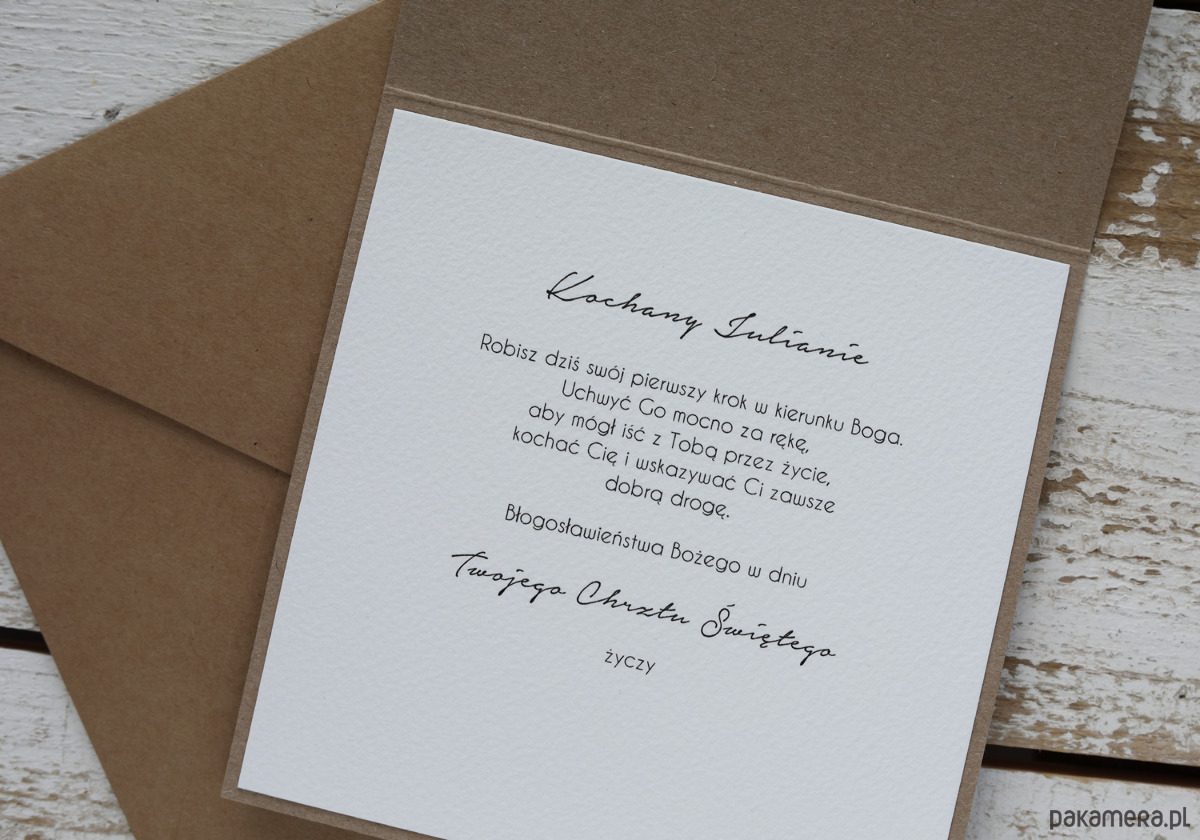 Kartka o wymiarach 14x14 cm wykonana z papieru kraftowego, papieru bawełnianego oraz z najlepszej jakości tekturki. Personalizacja na przodzie i w środku kartki. Proszę o przesłanie tekstu w uwagach do zamówienia.