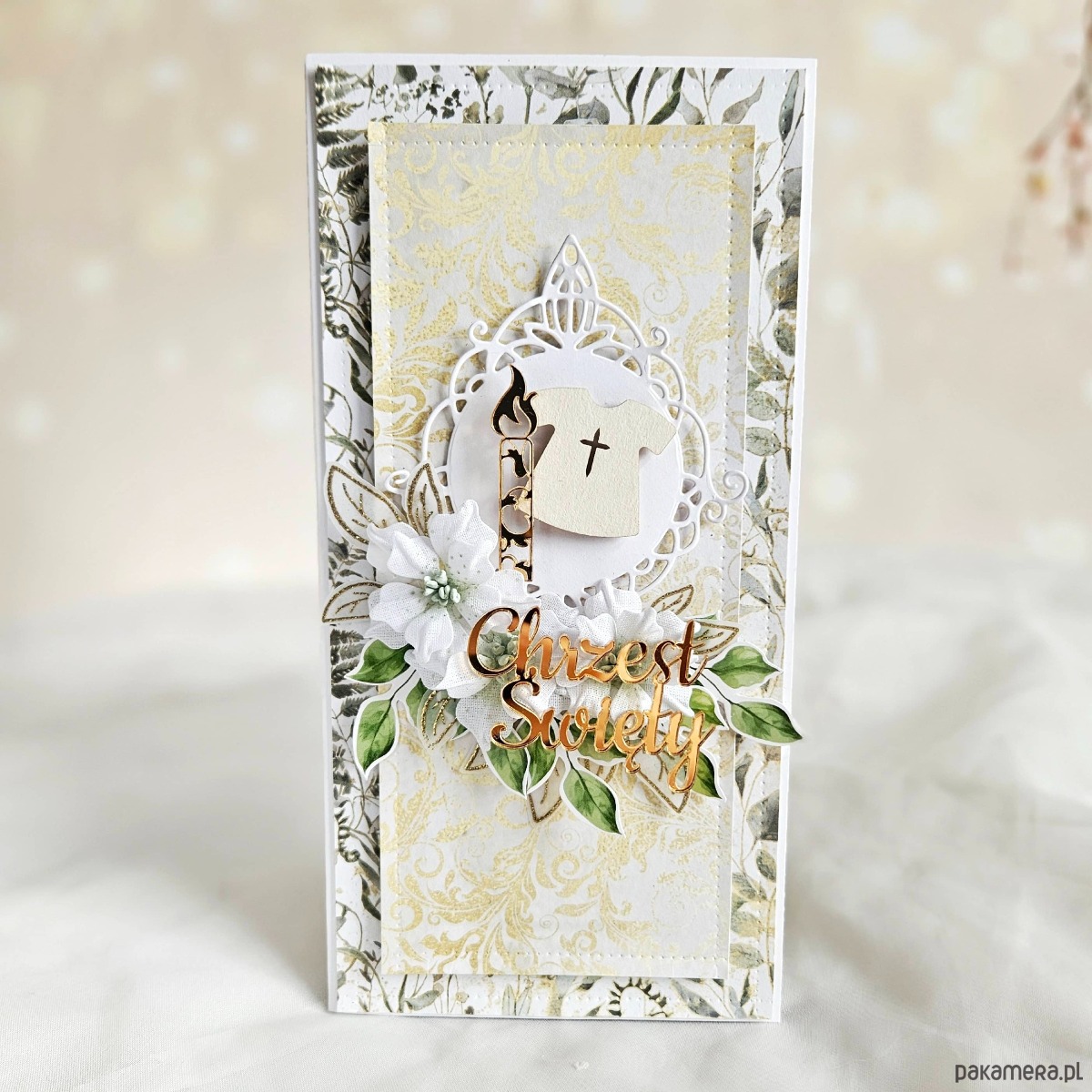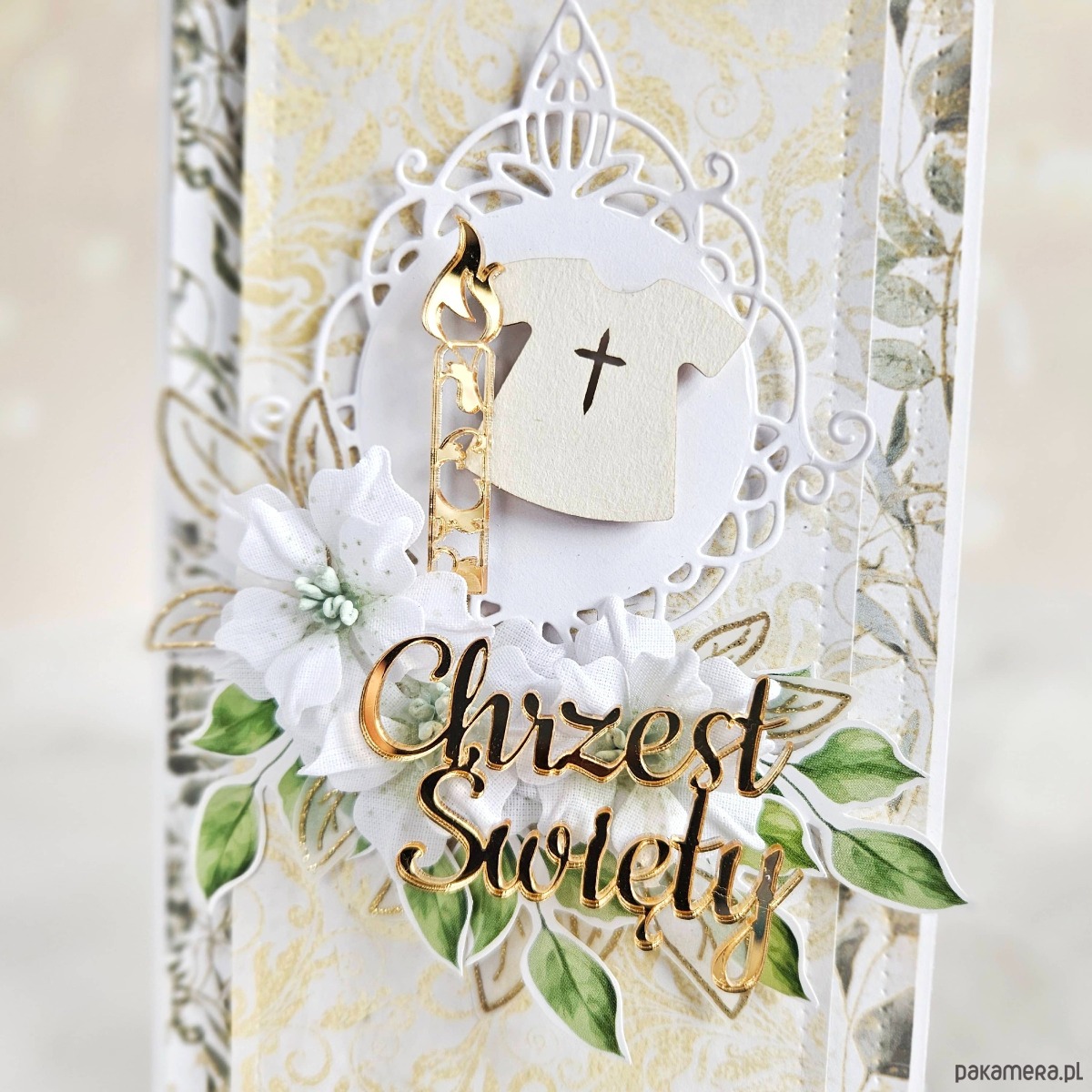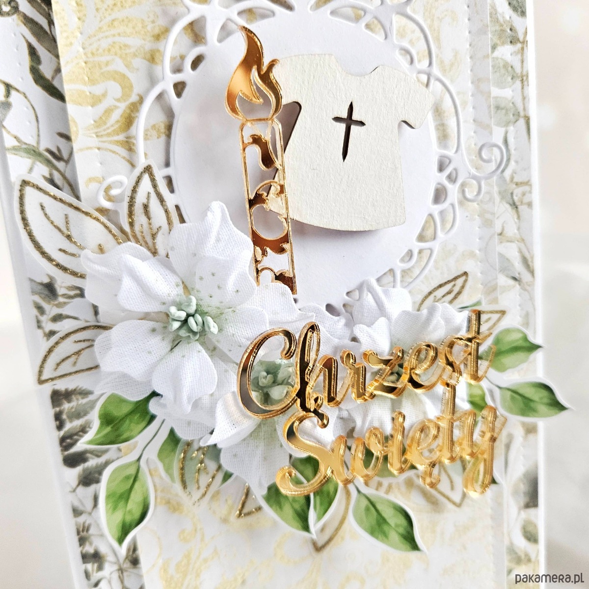 Szczegóły: Kartka w jasnych kolorach. Na froncie białe kwiaty, sztaka i złote dodatki z plexi.