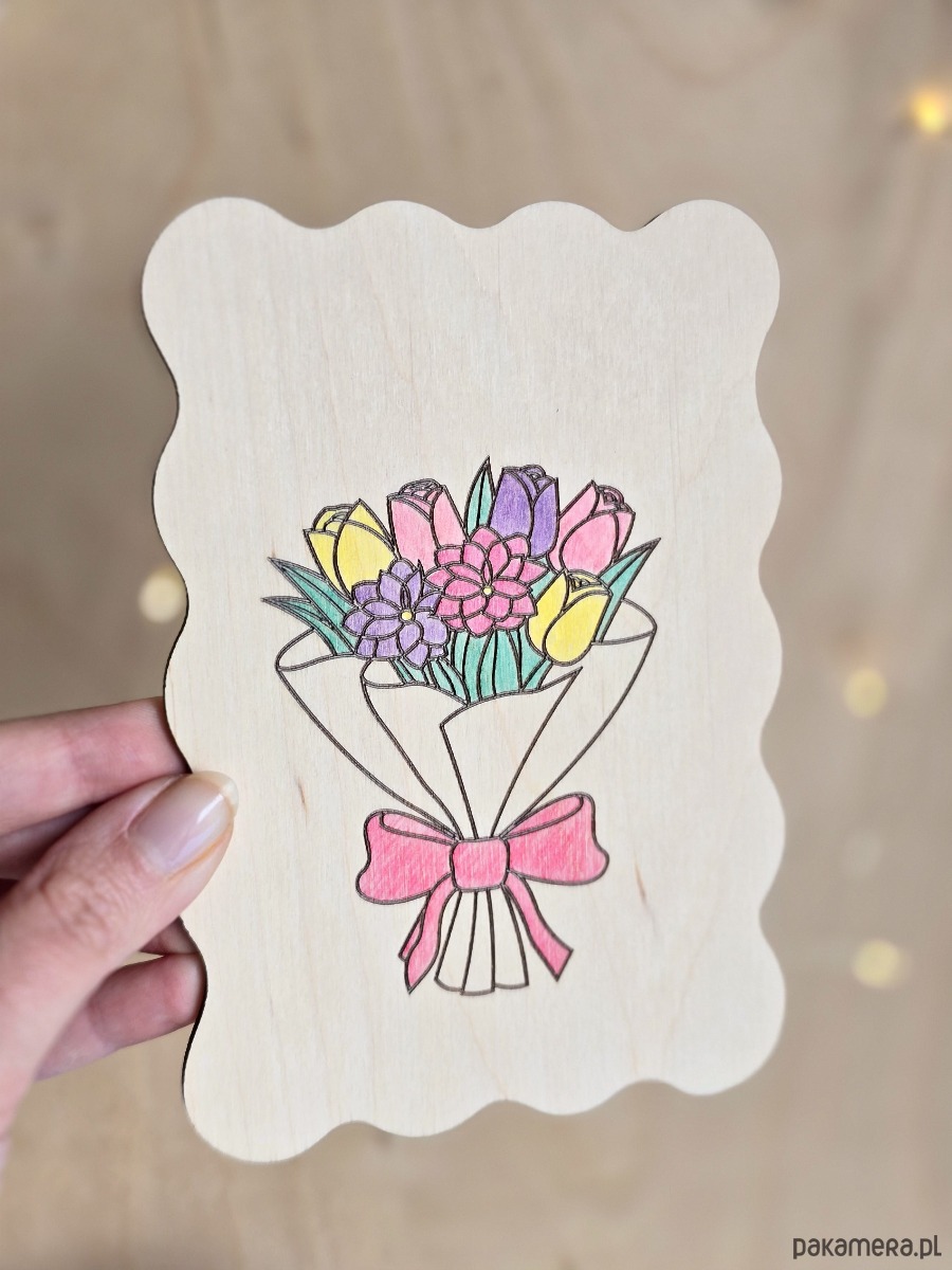 Kartkę możesz zostawić w jej naturalnej, rustykalnej wersji albo samodzielnie pokolorować wygrawerowany bukiet. Dzięki temu prezent nabiera jeszcze bardziej osobistego charakteru. To piękny sposób, żeby dodać coś od siebie i to niezależnie od wieku. Dla dorosłych to powrót do dziecięcych chwil i przygotowywania laurek dla Mamy, a dla dzieci, możliwość stworzenia własnego, wyjątkowego prezentu.