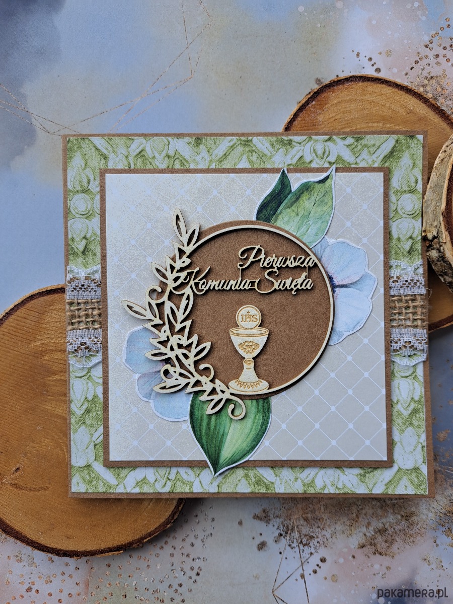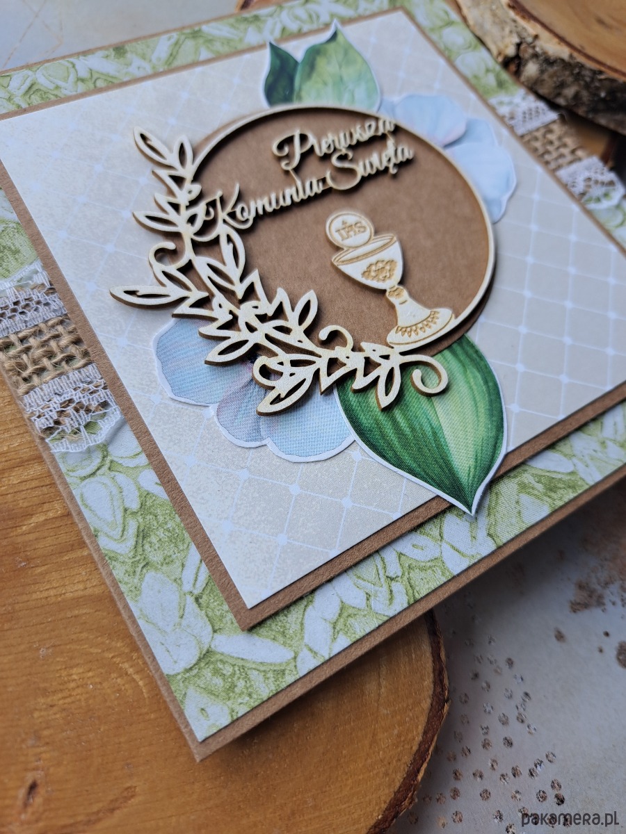 Kartka z okazji Pierwszej Komunii Świętej dla chłopca z ręcznie wycinanymi elementami.