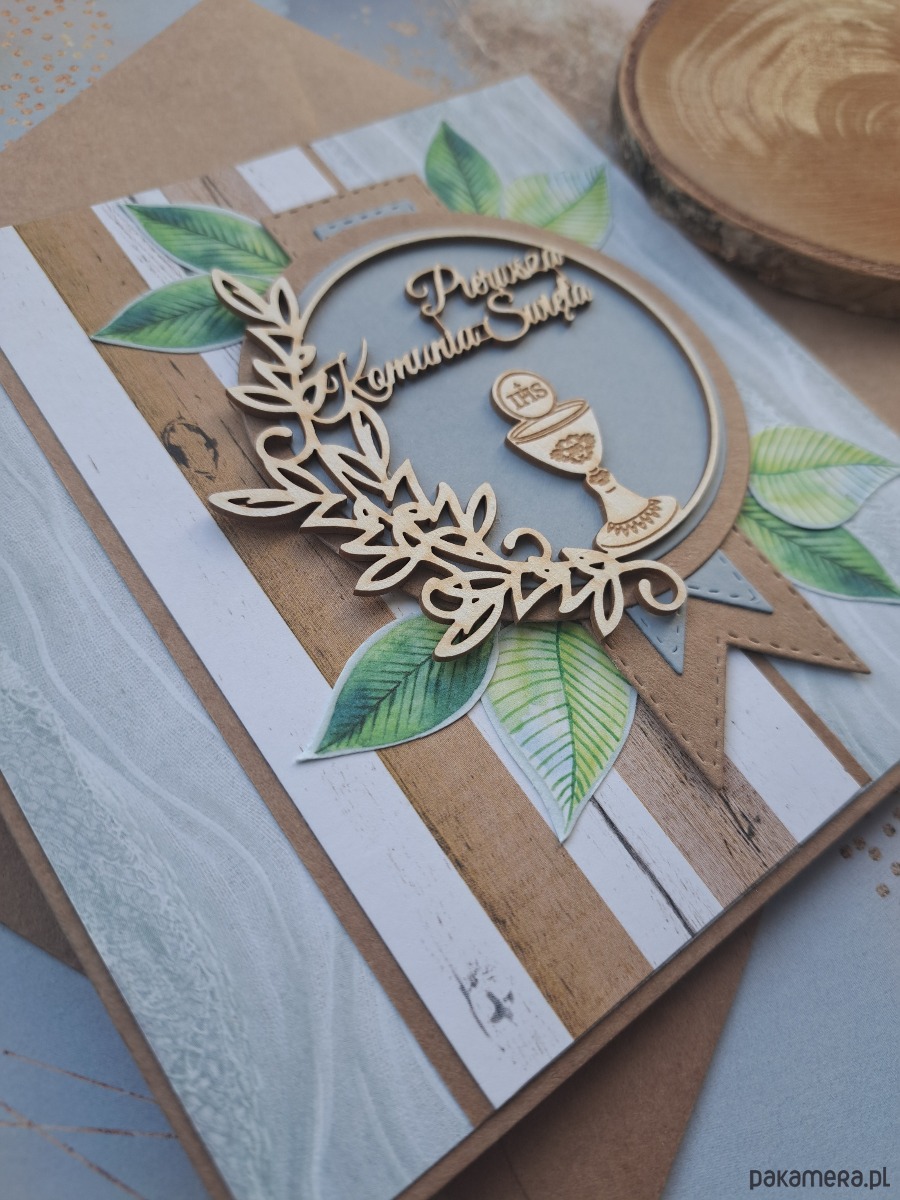 Kartka z okazji Pierwszej Komunii Świętej dla chłopca z ręcznie wycinanymi elementami.
