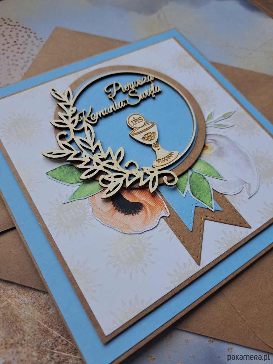 Kartka z okazji Pierwszej Komunii Świętej dla chłopca z ręcznie wycinanymi elementami.