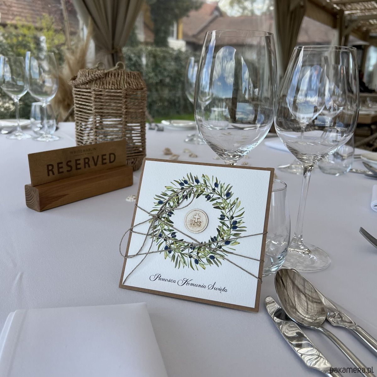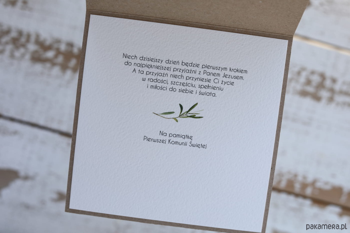 Kartka o wymiarach 14x14 cm wykonana jest z papieru kraftowego oraz papieru bawełnianego w odcieniu śmietanki z użyciem ozdoby tekturkowej. Kartka otwierana do góry, w środku wklejona jest kartka z papieru bawełnianego z gotowymi życzeniami. Personalizacja możliwa za dopłatą. W zestawie z kopertą.
