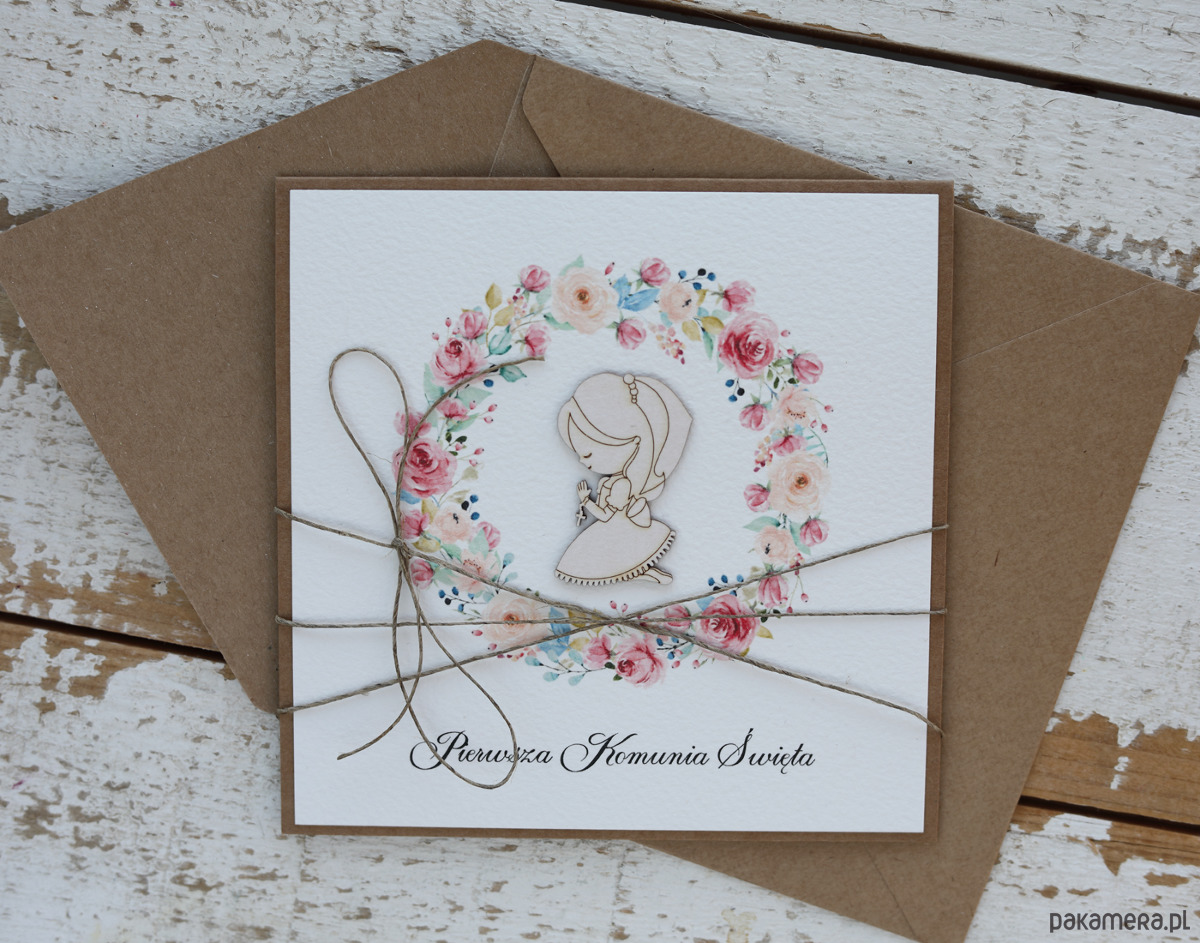 Kartka na komunię o wymiarach 14x14 cm wykonana z papieru kraftowego, papieru bawełnianego w kolorze śmietanki, tekturki - przewiązana lnianym sznueczkiem.