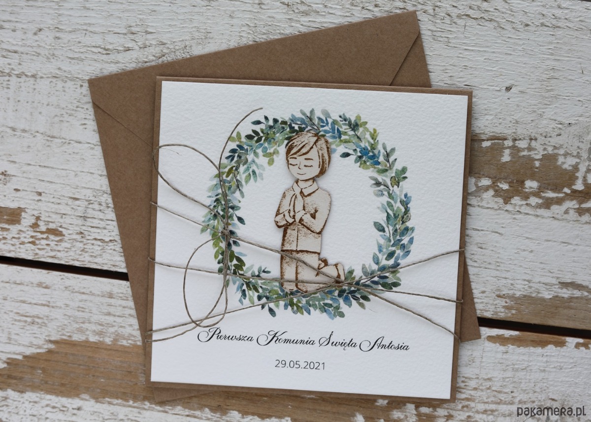 Kartka na komunię o wymiarach 14x14 cm wykonana z papieru kraftowego, papieru bawełnianego w kolorze śmietanki, tekturki - przewiązana lnianym sznueczkiem.