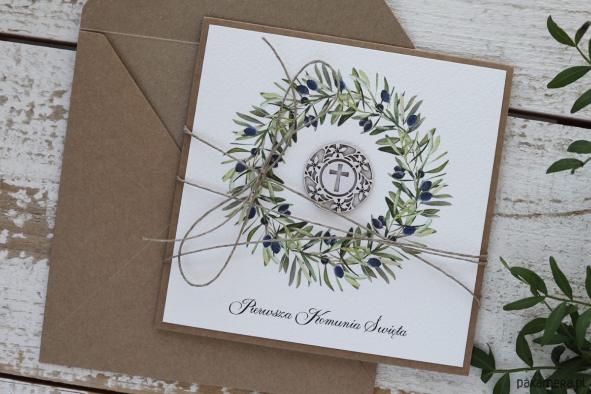 Kartka na komunię o wymiarach 14x14 cm wykonana z papieru kraftowego, papieru bawełnianego w kolorze śmietanki, tekturki - przewiązana lnianym sznueczkiem.