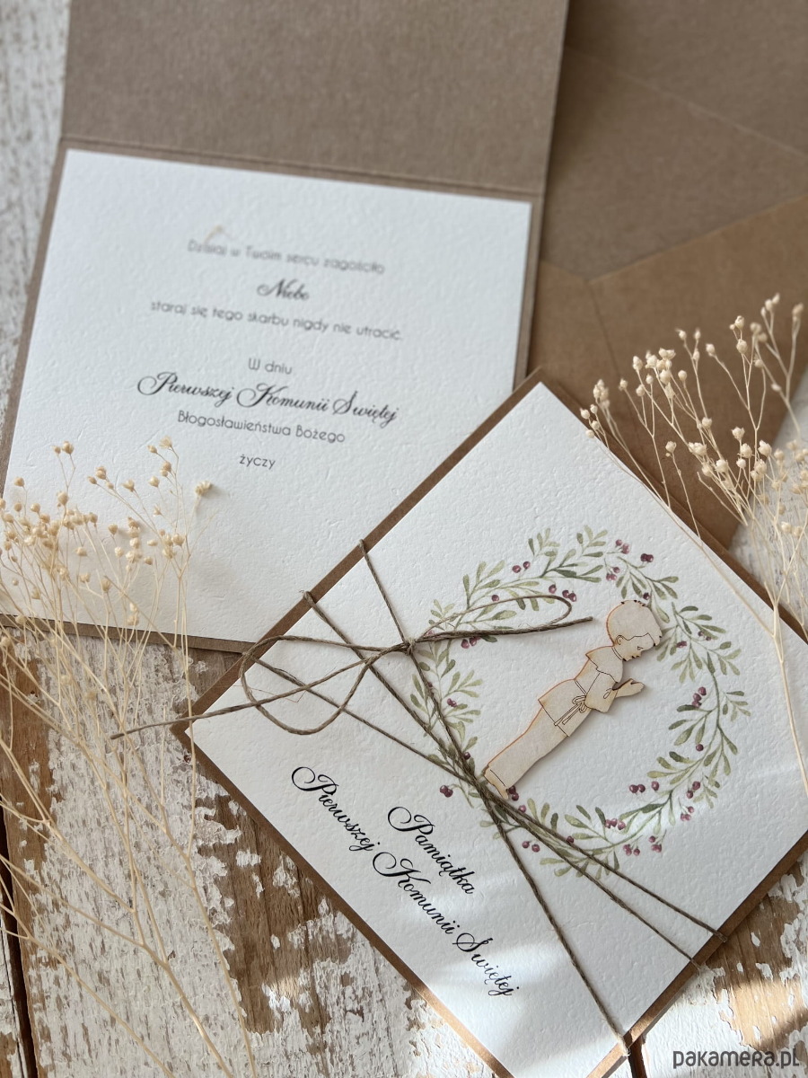 Wyjątkowa kartka na komunię wykonana jest z papieru kraftowego oraz papieru bawełnianego w odcieniu śmietanki z użyciem ozdoby tekturkowej. Kartka otwierana do góry, w środku wklejona jest kartka z papieru bawełnianego - gotowe wyjątkowe życzenia są już w środku - personalizacja możliwa za dopłatą. W zestawie z kopertą.