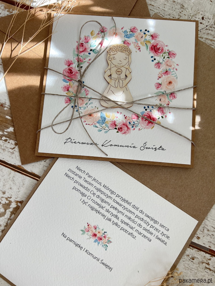 Wyjątkowa kartka na komunię wykonana jest z papieru kraftowego oraz papieru bawełnianego w odcieniu śmietanki z użyciem ozdoby tekturkowej. Kartka otwierana do góry, w środku wklejona jest kartka z papieru bawełnianego - gotowe wyjątkowe życzenia są już w środku - personalizacja możliwa za dopłatą. W zestawie z kopertą.