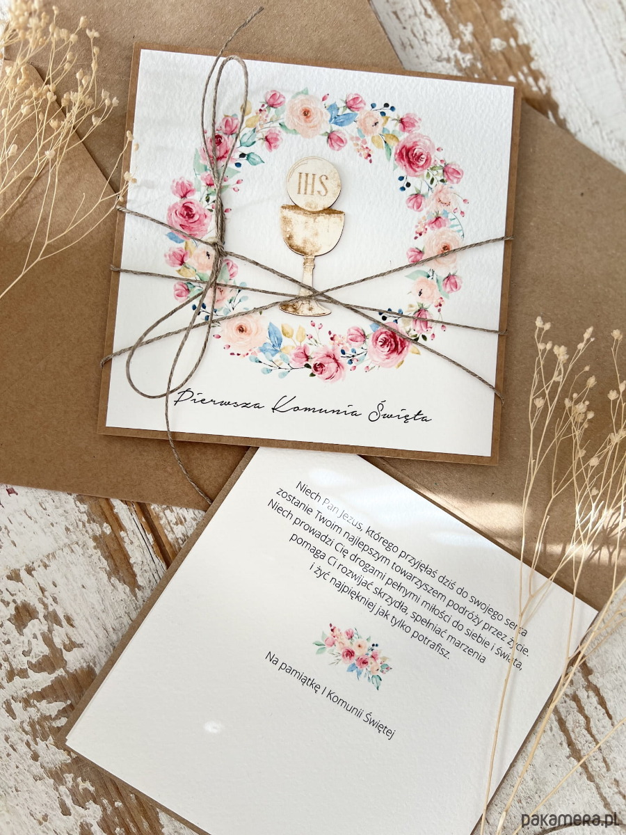 Wyjątkowa kartka na komunię wykonana jest z papieru kraftowego oraz papieru bawełnianego w odcieniu śmietanki z użyciem ozdoby tekturkowej. Kartka otwierana do góry, w środku wklejona jest kartka z papieru bawełnianego - gotowe wyjątkowe życzenia są już w środku - personalizacja możliwa za dopłatą. W zestawie z kopertą.