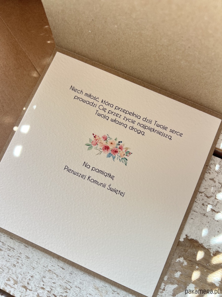 Wyjątkowa kartka na komunię wykonana jest z papieru kraftowego oraz papieru bawełnianego w odcieniu ecru z użyciem ozdoby tekturkowej. Kartka otwierana do góry, gotowe życzenia są już nadrukowane w środku (brak możliwości zmiany). W zestawie z pudełkiem z okienkiem.