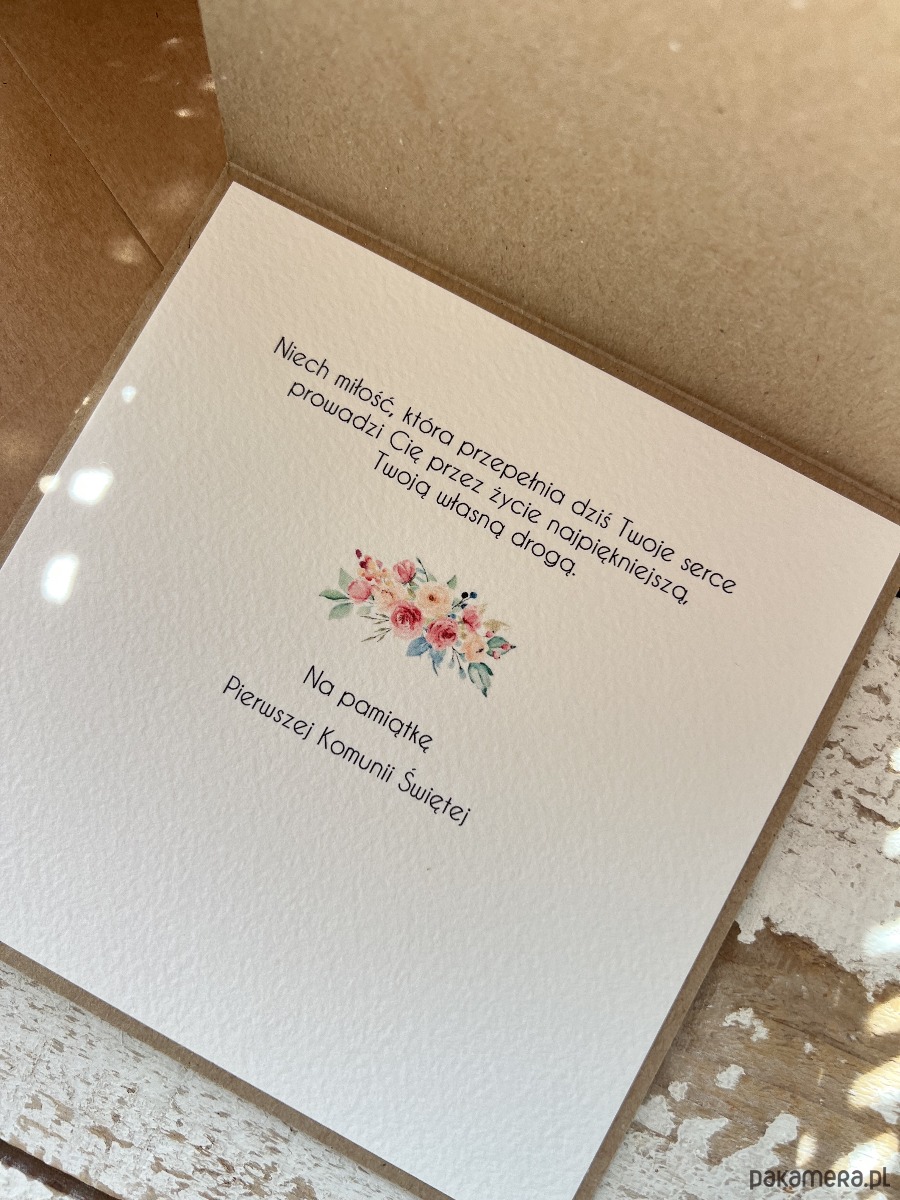 Wyjątkowa kartka na komunię wykonana jest z papieru kraftowego oraz papieru bawełnianego w odcieniu śmietanki z użyciem ozdoby tekturkowej. Kartka otwierana do góry, gotowe życzenia są już nadrukowane w środku (brak możliwości zmiany). W zestawie z pudełkiem z okienkiem.