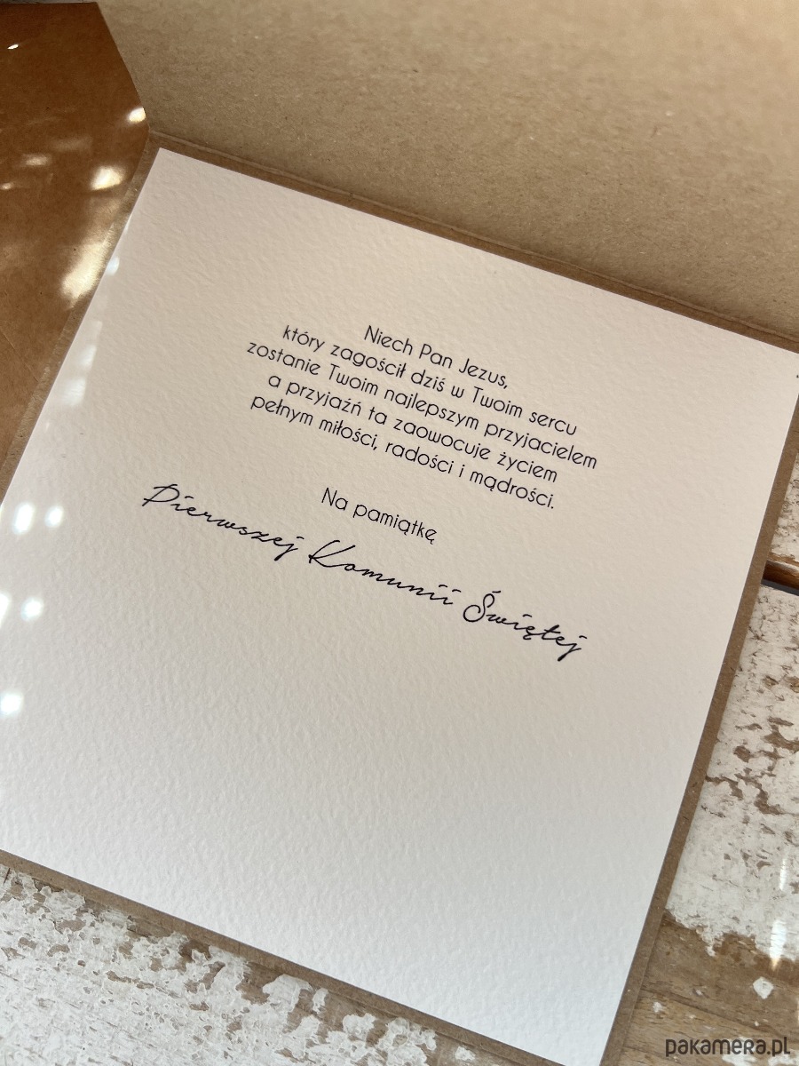 Wyjątkowa kartka na komunię wykonana jest z papieru kraftowego oraz papieru bawełnianego w odcieniu śmietanki z użyciem ozdoby tekturkowej. Kartka otwierana do góry, gotowe życzenia są już nadrukowane w środku (brak możliwości zmiany). W zestawie z pudełkiem z okienkiem.