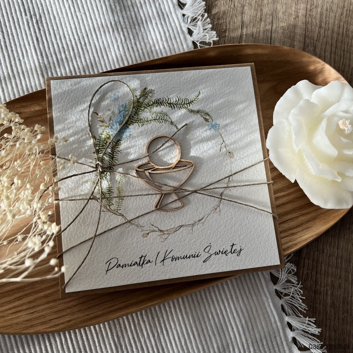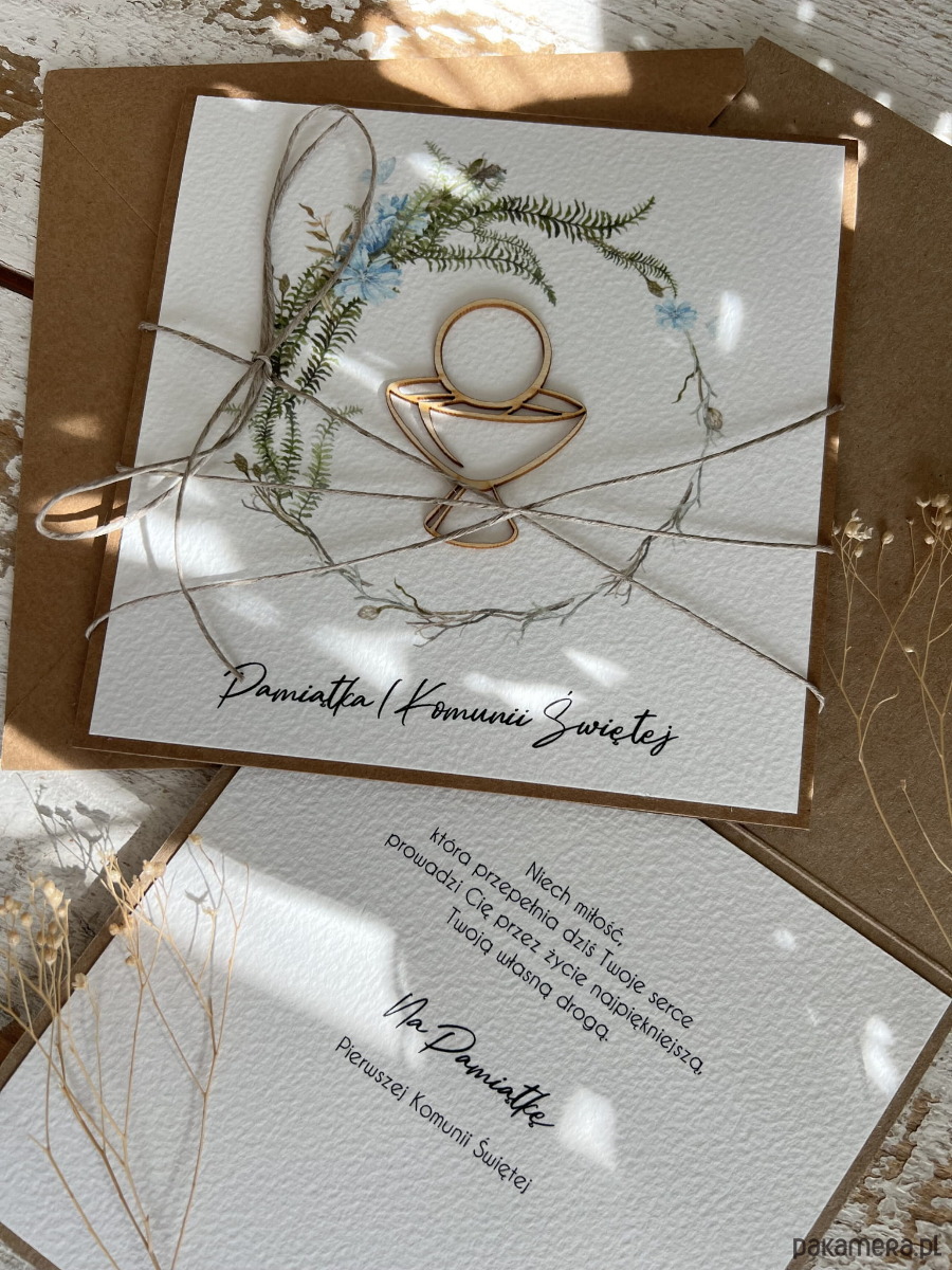 Wyjątkowa kartka na komunię wykonana jest z papieru kraftowego oraz papieru bawełnianego w odcieniu śmietanki z użyciem ozdoby tekturkowej. Kartka otwierana do góry, w środku wklejona jest kartka z papieru bawełnianego - gotowe wyjątkowe życzenia są już w środku (brak możliwości zmiany). W zestawie z kopertą.