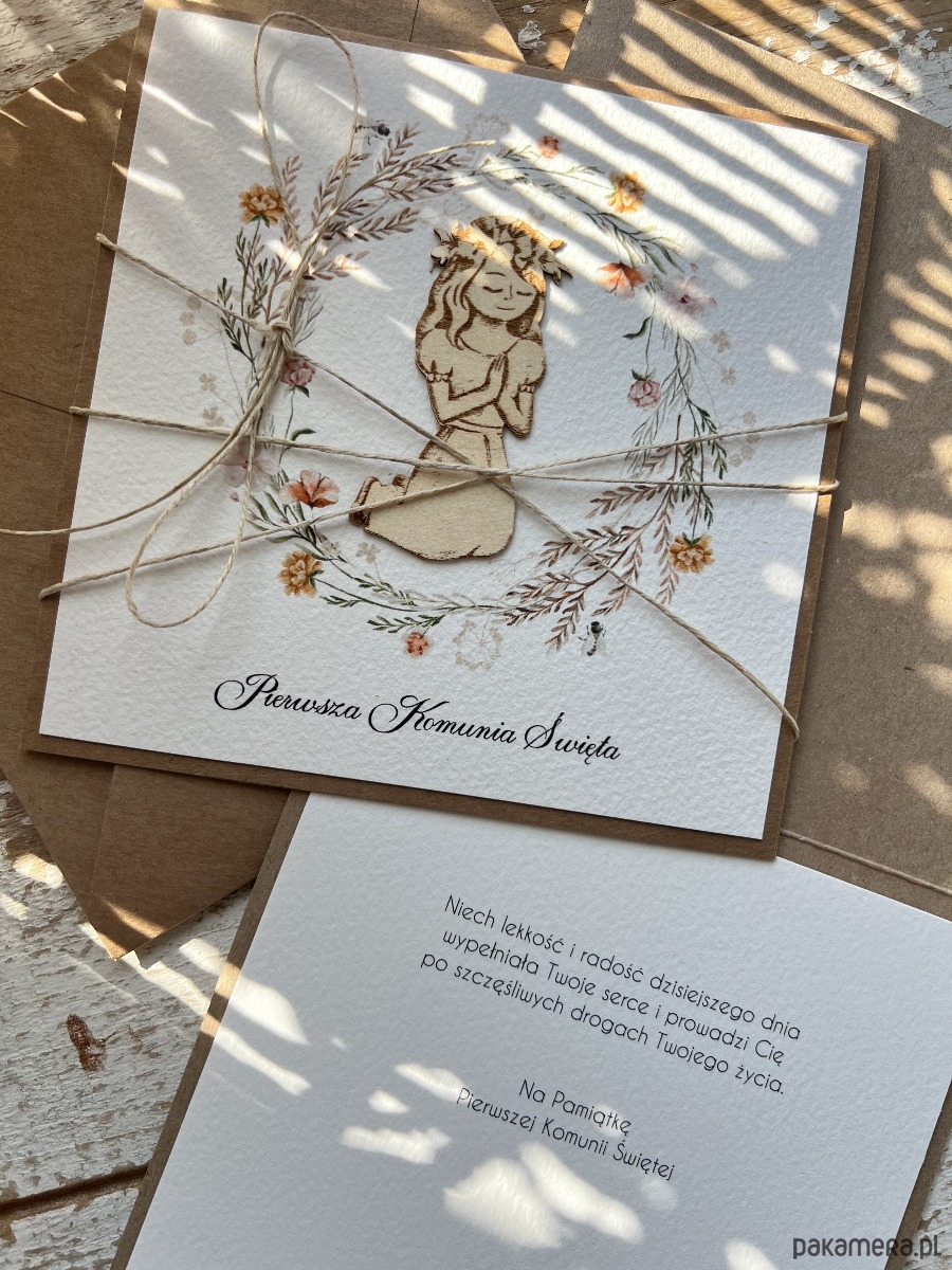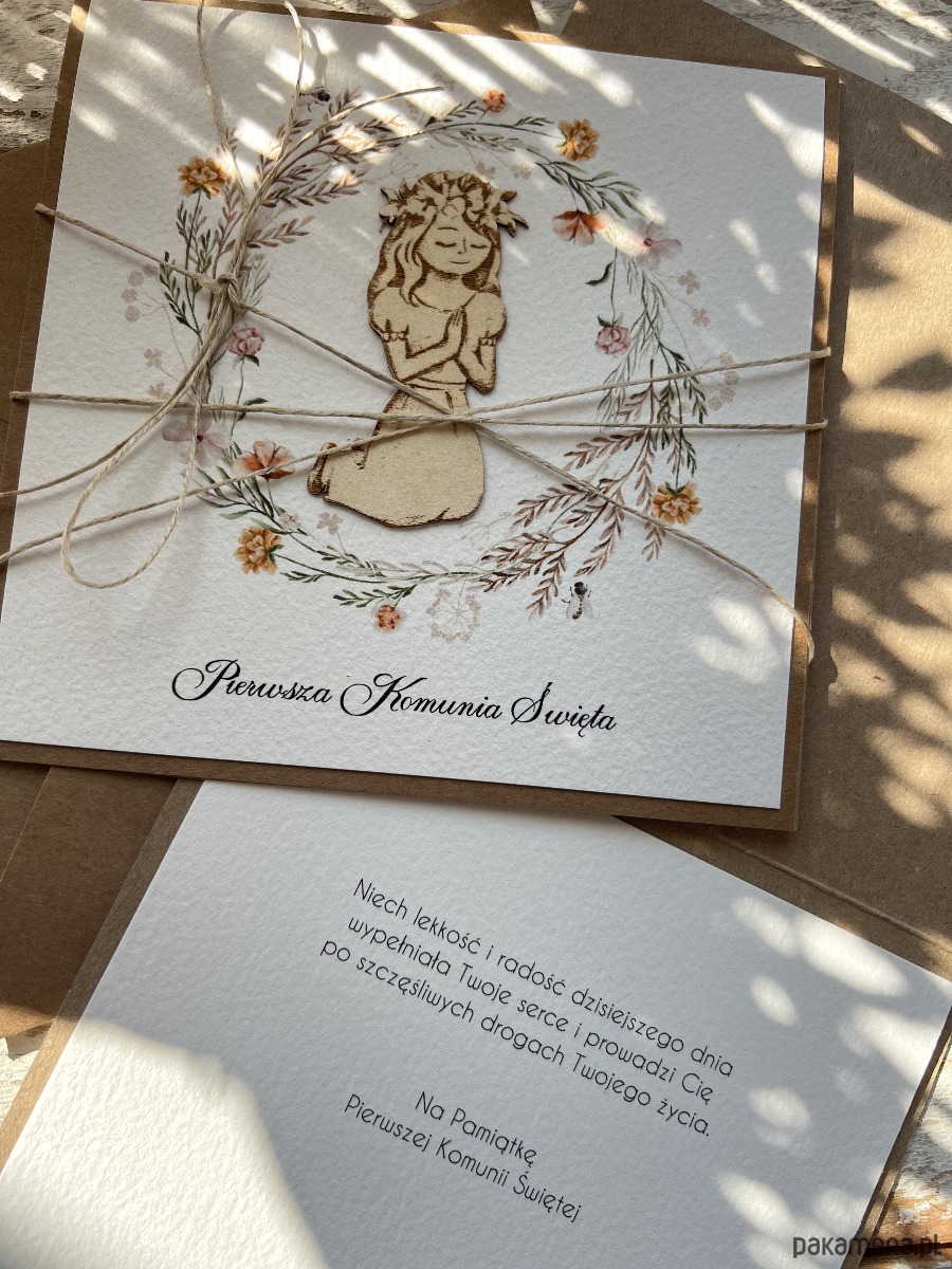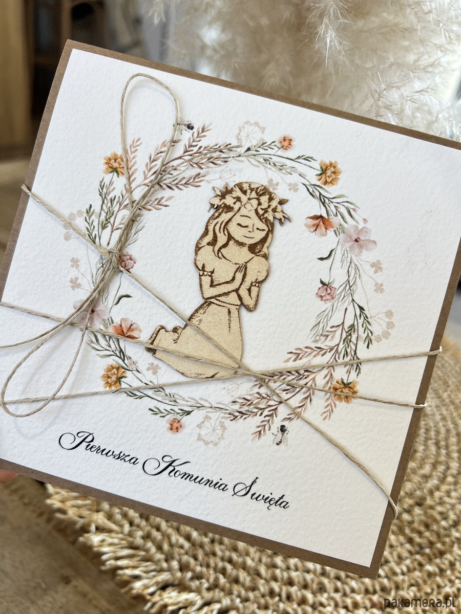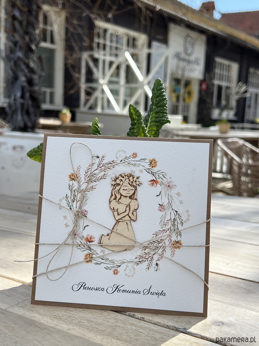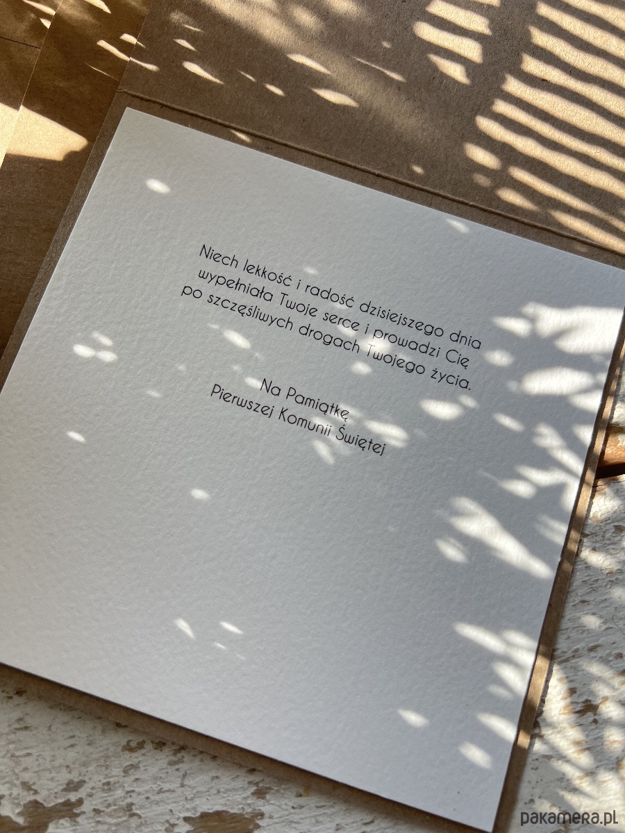 Wyjątkowa kartka na komunię wykonana jest z papieru kraftowego oraz papieru bawełnianego w odcieniu śmietanki z użyciem ozdoby tekturkowej. Kartka otwierana do góry, w środku wklejona jest kartka z papieru bawełnianego - gotowe wyjątkowe życzenia są już w środku (brak możliwości zmiany). W zestawie z kopertą.