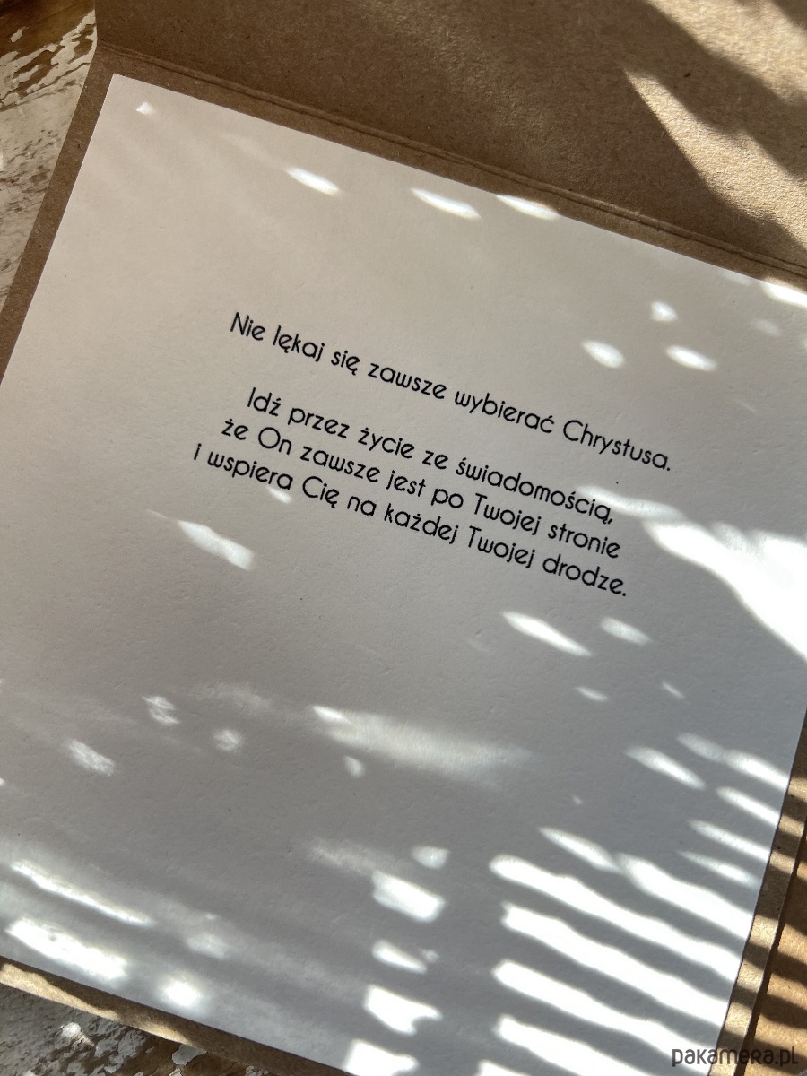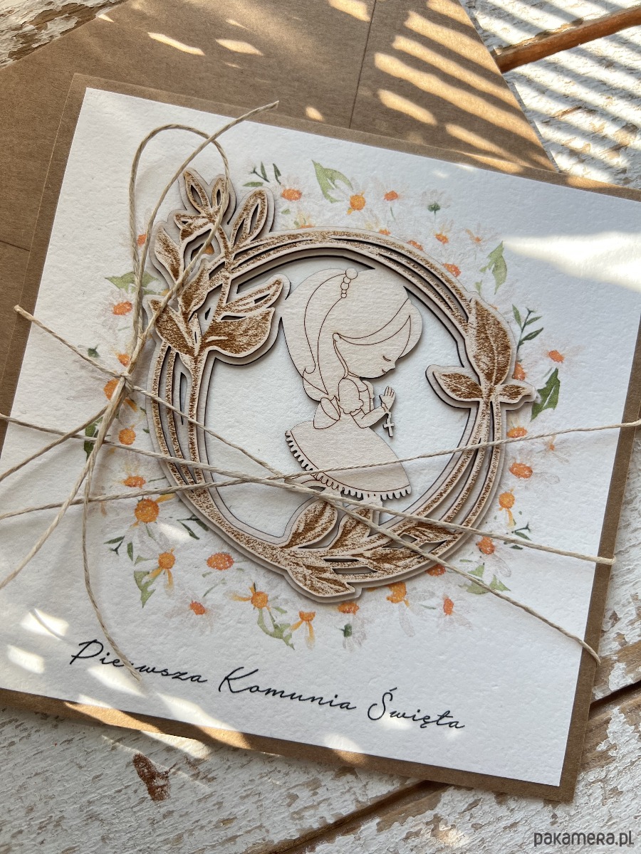 Wyjątkowa kartka na komunię wykonana jest z papieru kraftowego oraz papieru czerpanego w odcieniu śmietanki z użyciem ozdoby tekturkowej. Kartka otwierana do góry, w środku wklejona jest kartka z papieru czerpanego - gotowe wyjątkowe życzenia są już w środku (brak możliwości zmiany). W zestawie z kopertą.