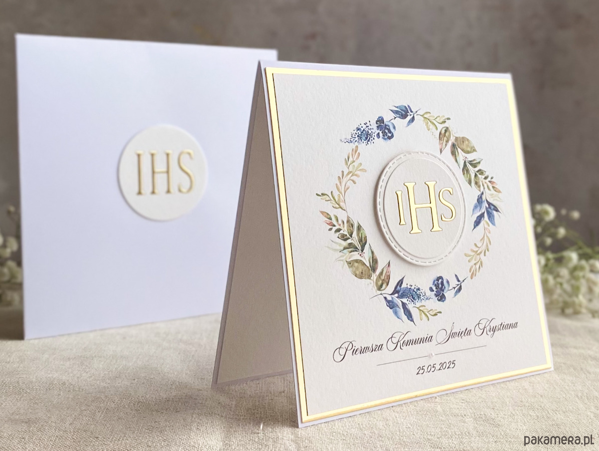 Pamiątka z delikatnym wiankiem graficznym i biało-złotą ozdobą. Zestaw z naszej autorskiej kolekcji - Linia GOLD.