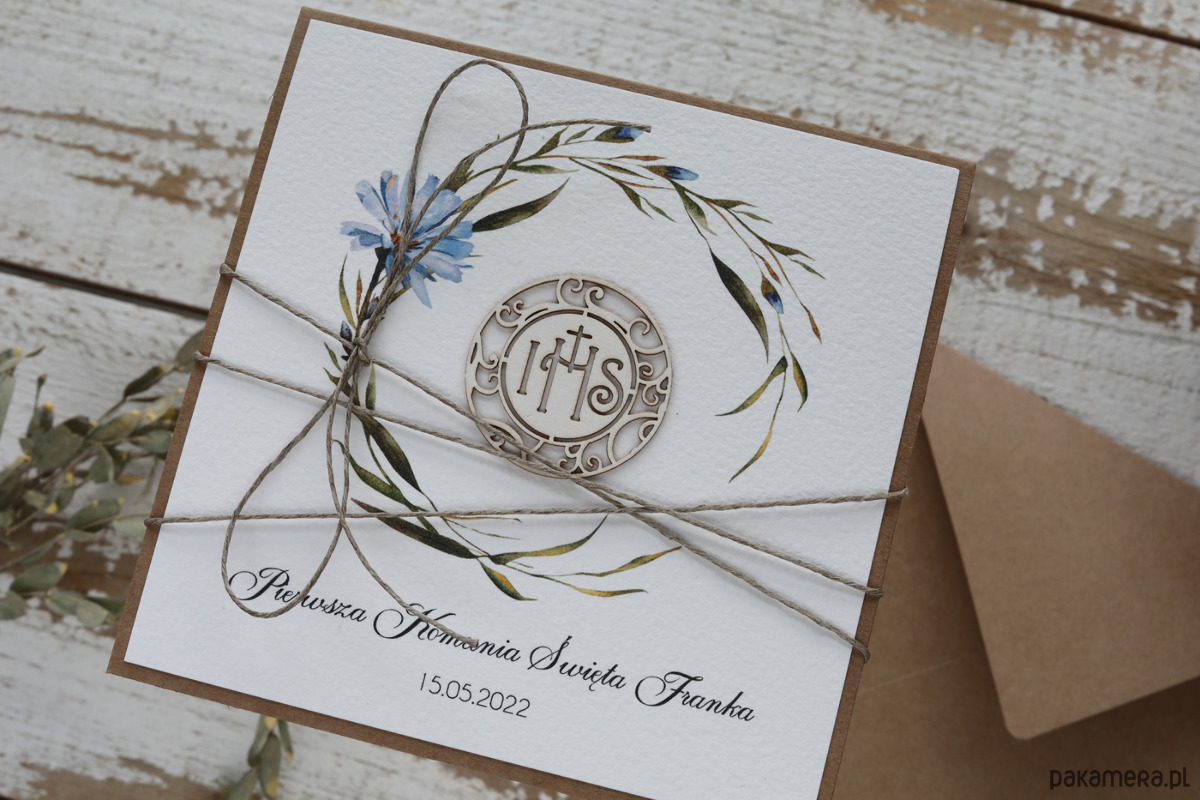 Przedmiotem oferty jest rustykalna kartka na komunię z kopertą.