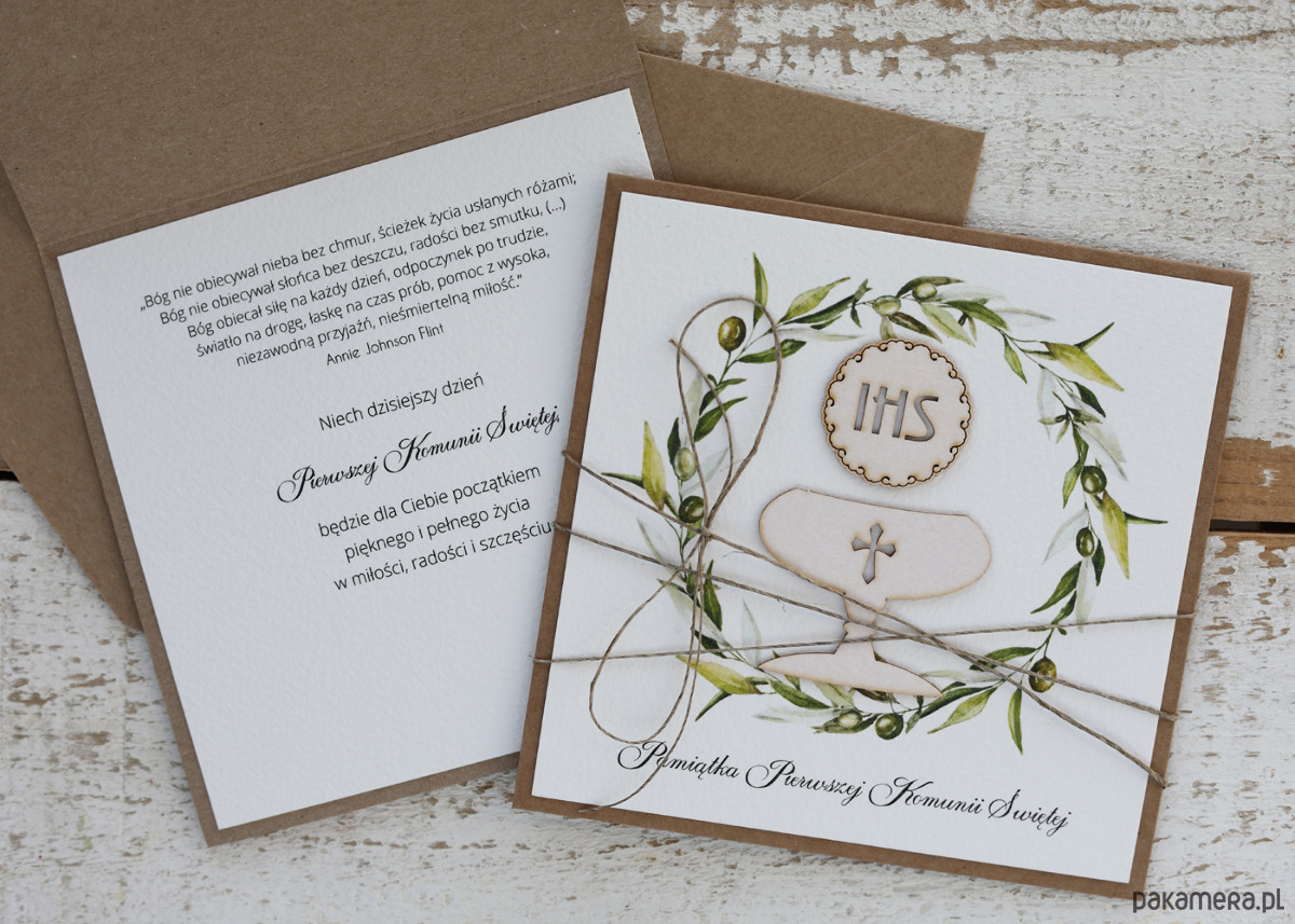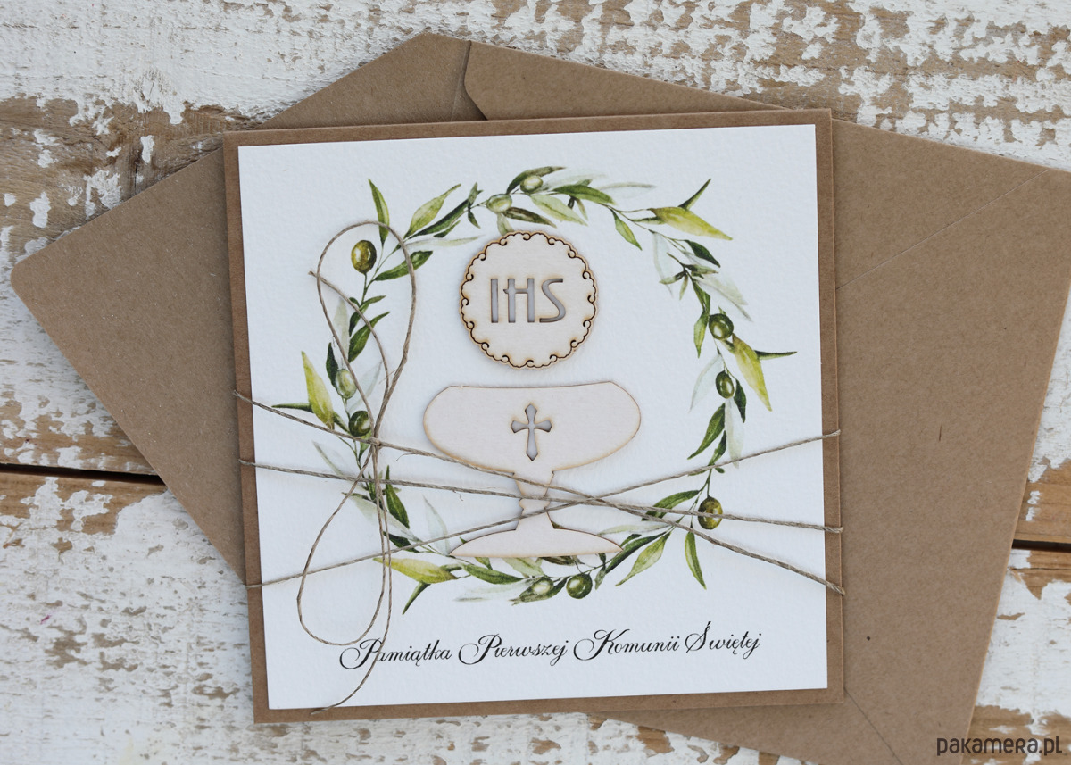 Przedmiotem oferty jest rustykalna kartka na komunię z kopertą.