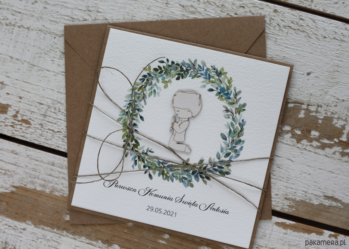 Przedmiotem oferty jest rustykalna kartka na komunię z kopertą. Imię dziecka i życzenia są przykładowe.