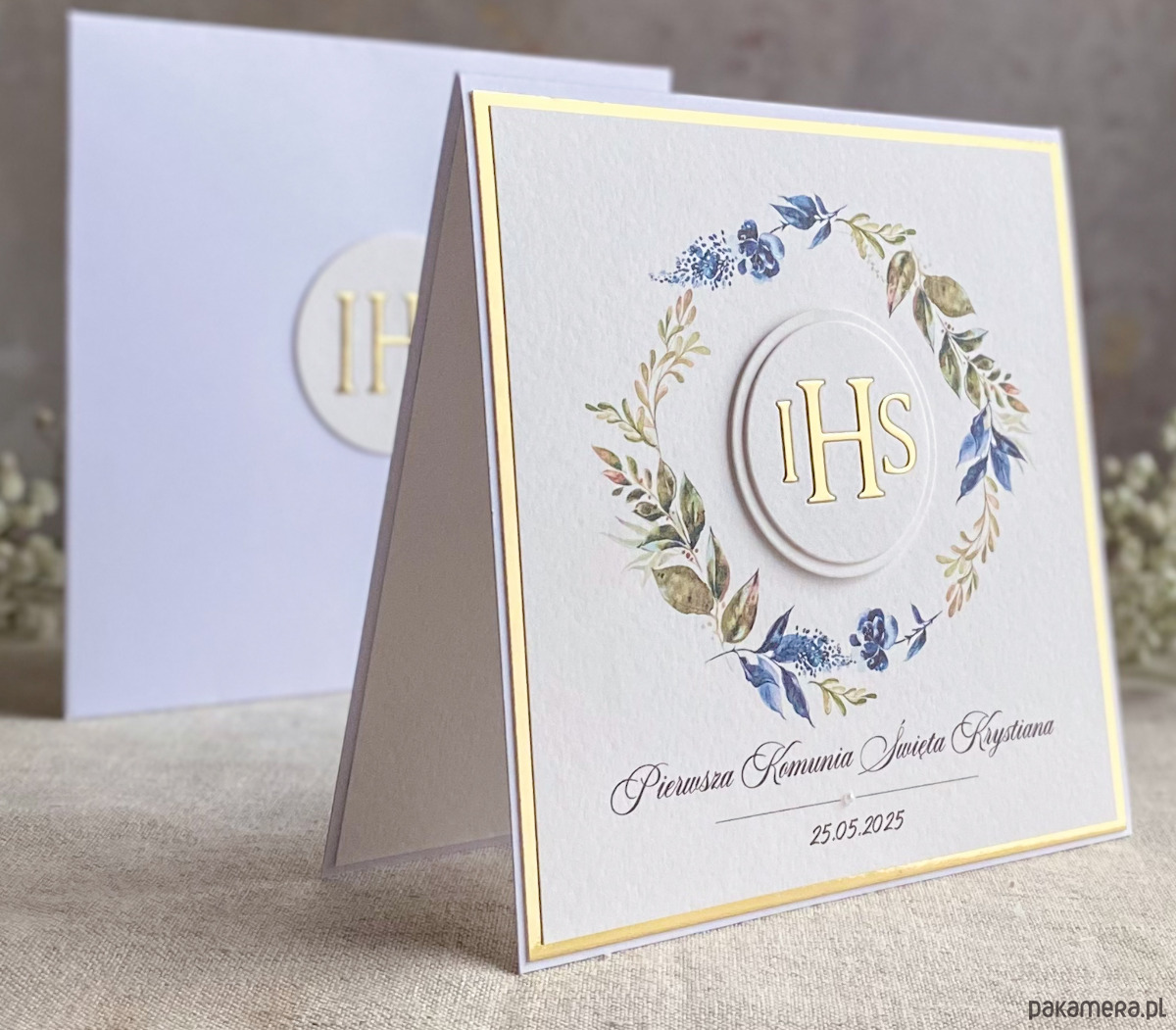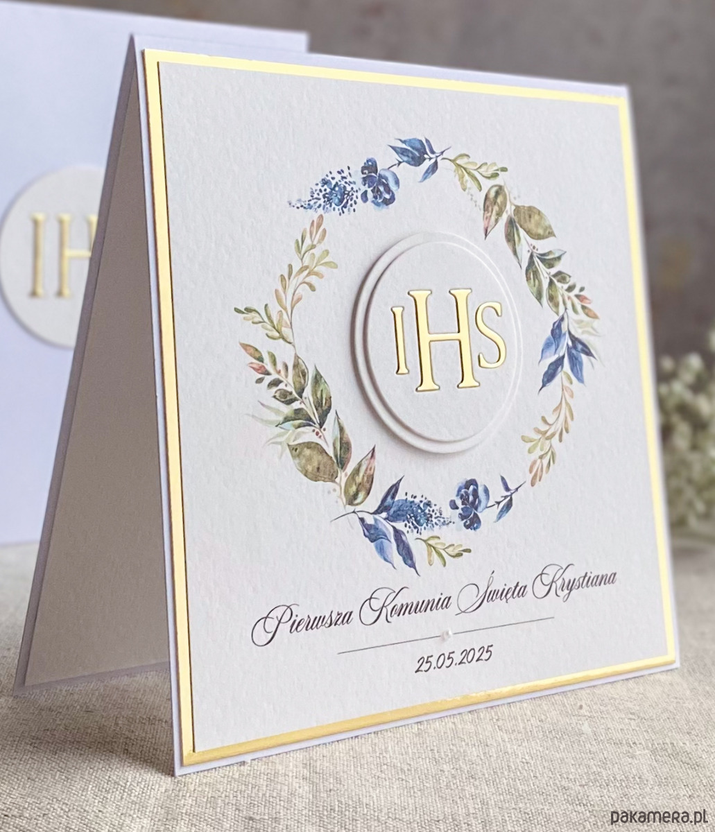 Pamiątka z delikatnym wiankiem graficznym i ręcznie wyciętą biało-złotą ozdobą. Zestaw z naszej autorskiej kolekcji - Linia GOLD.