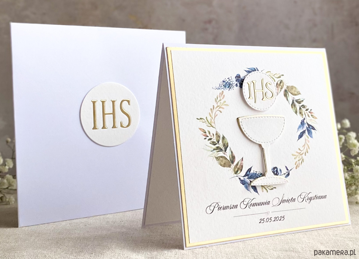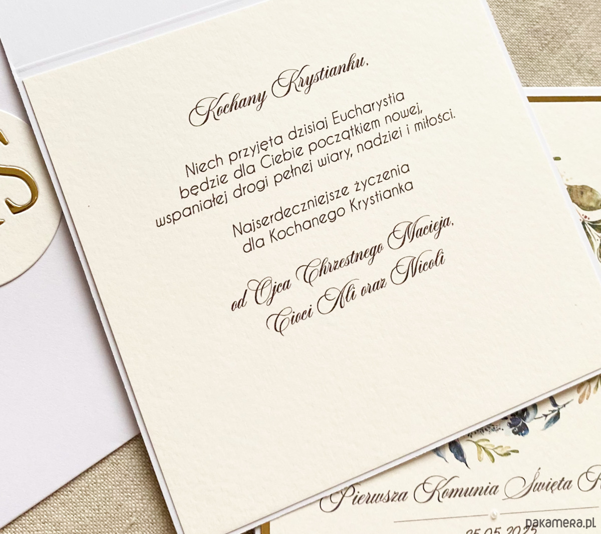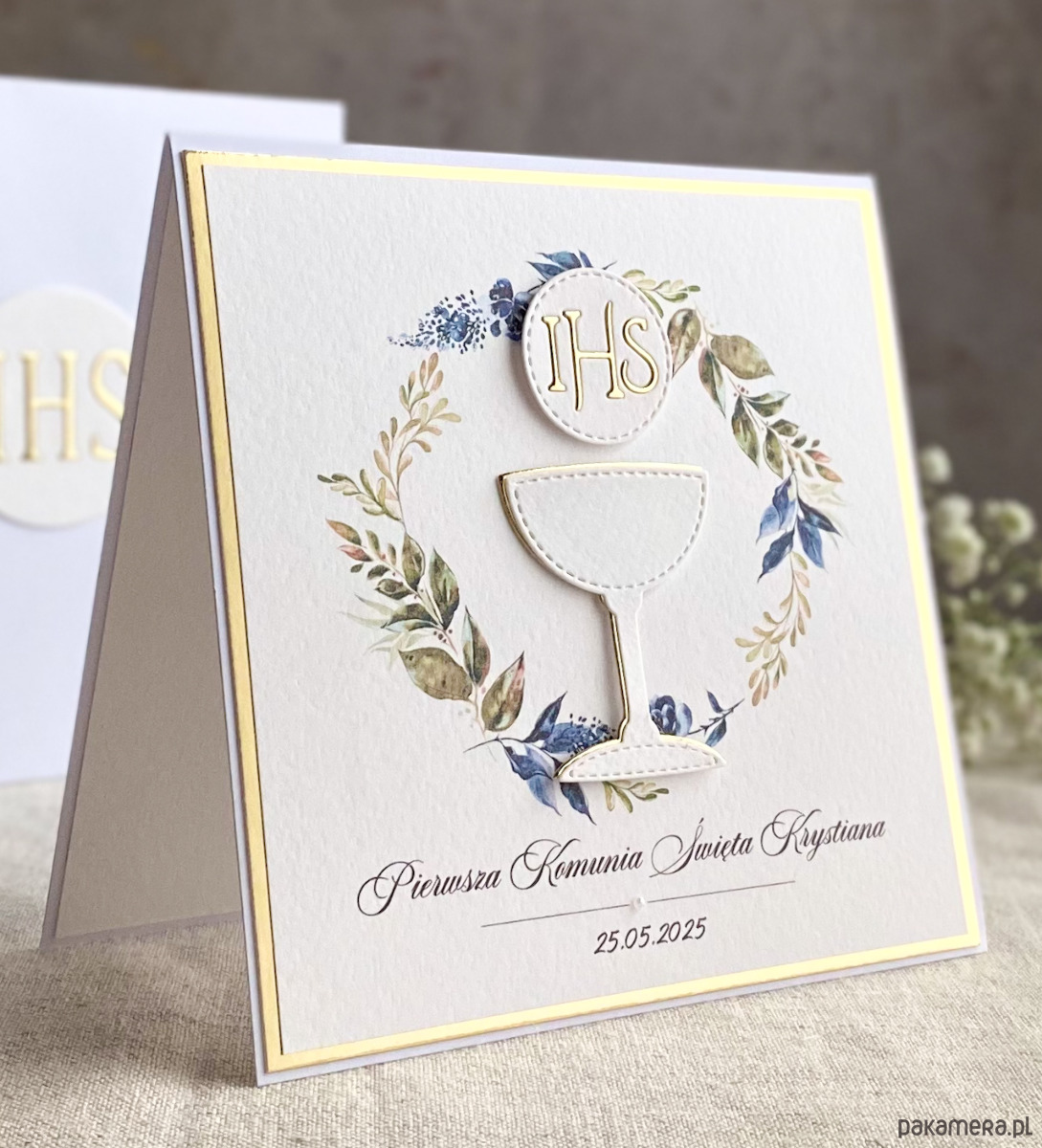 Pamiątka z delikatnym wiankiem graficznym i ręcznie wyciętą biało-złotą ozdobą. Zestaw z naszej autorskiej kolekcji - Linia GOLD.