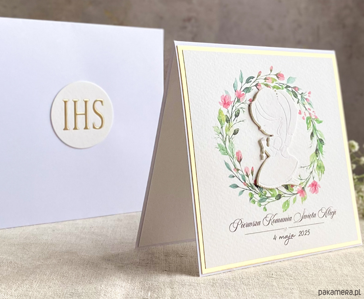 Pamiątka z delikatnym wiankiem graficznym i ręcznie wyciętą biało-złotą ozdobą. Zestaw z naszej autorskiej kolekcji - Linia GOLD.