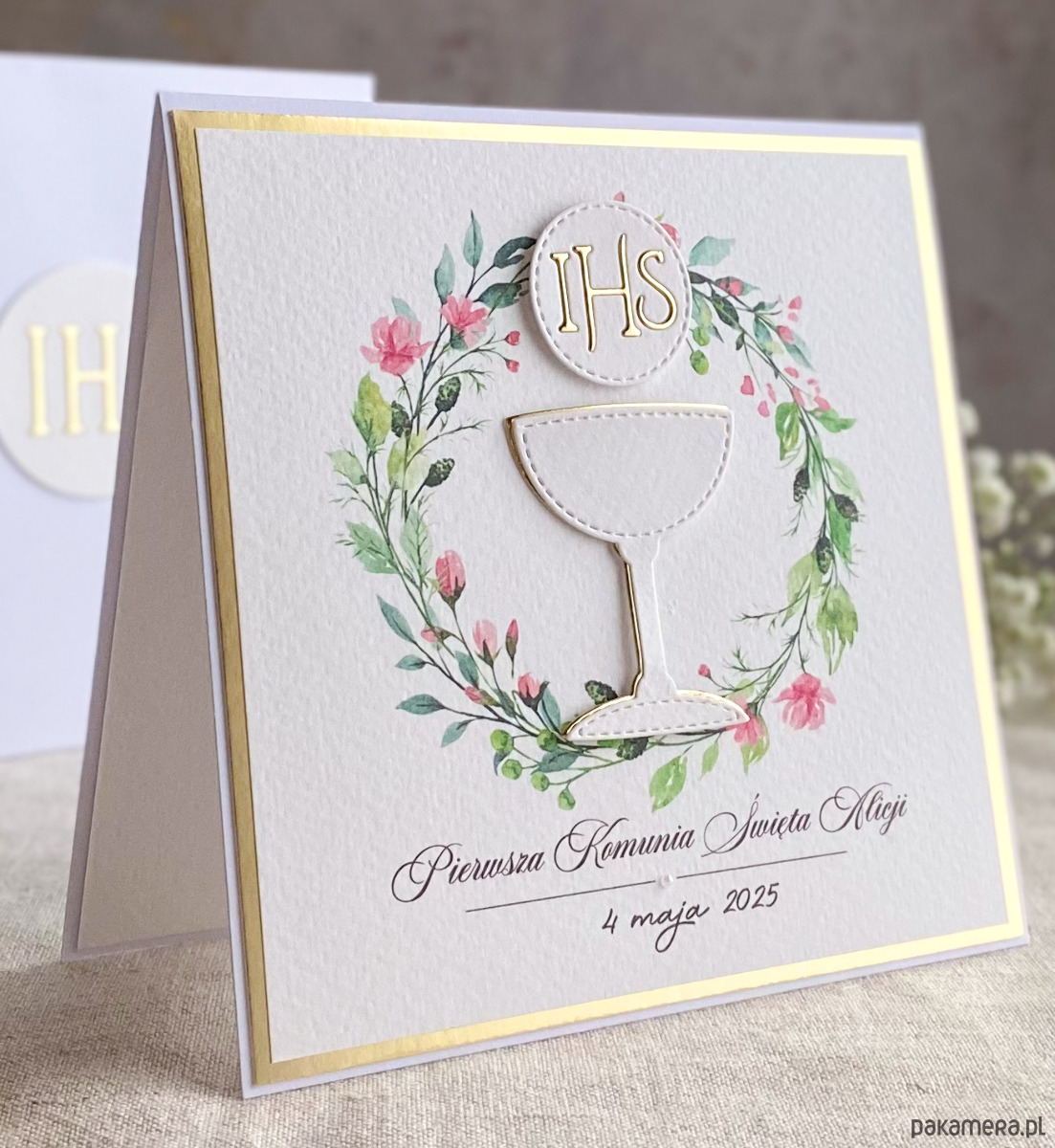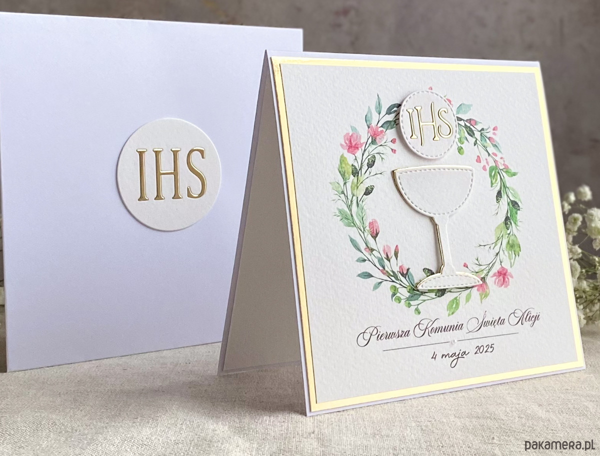 Pamiątka z delikatnym wiankiem graficznym i ręcznie wyciętą biało-złotą ozdobą. Zestaw z naszej autorskiej kolekcji - Linia GOLD.