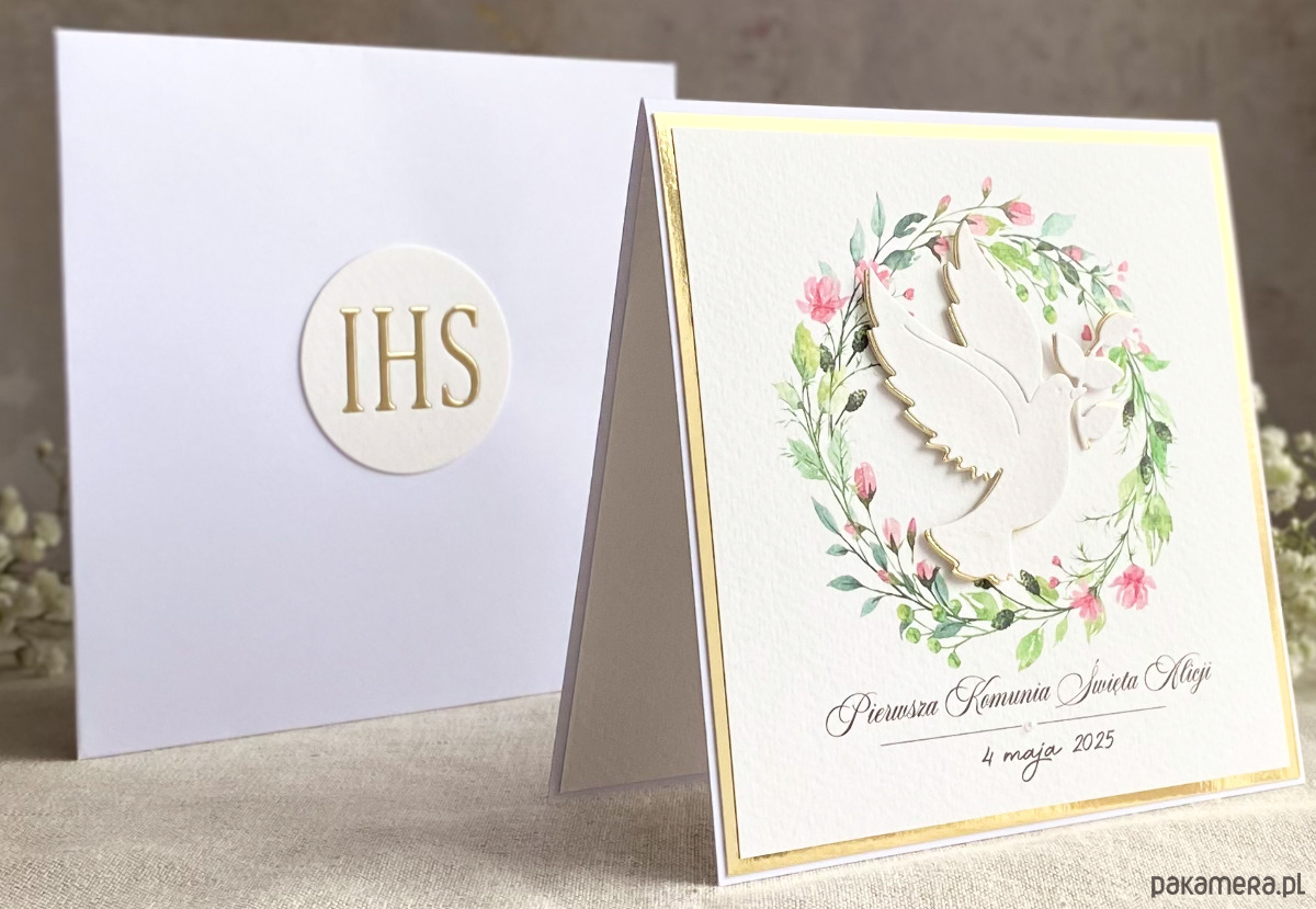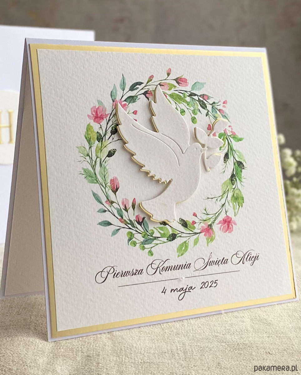 Pamiątka z delikatnym wiankiem graficznym i ręcznie wyciętą biało-złotą ozdobą. Zestaw z naszej autorskiej kolekcji - Linia GOLD.