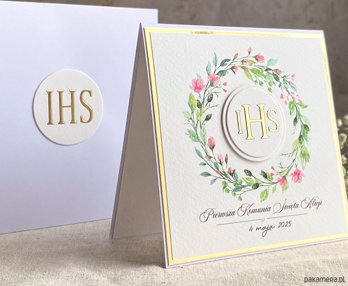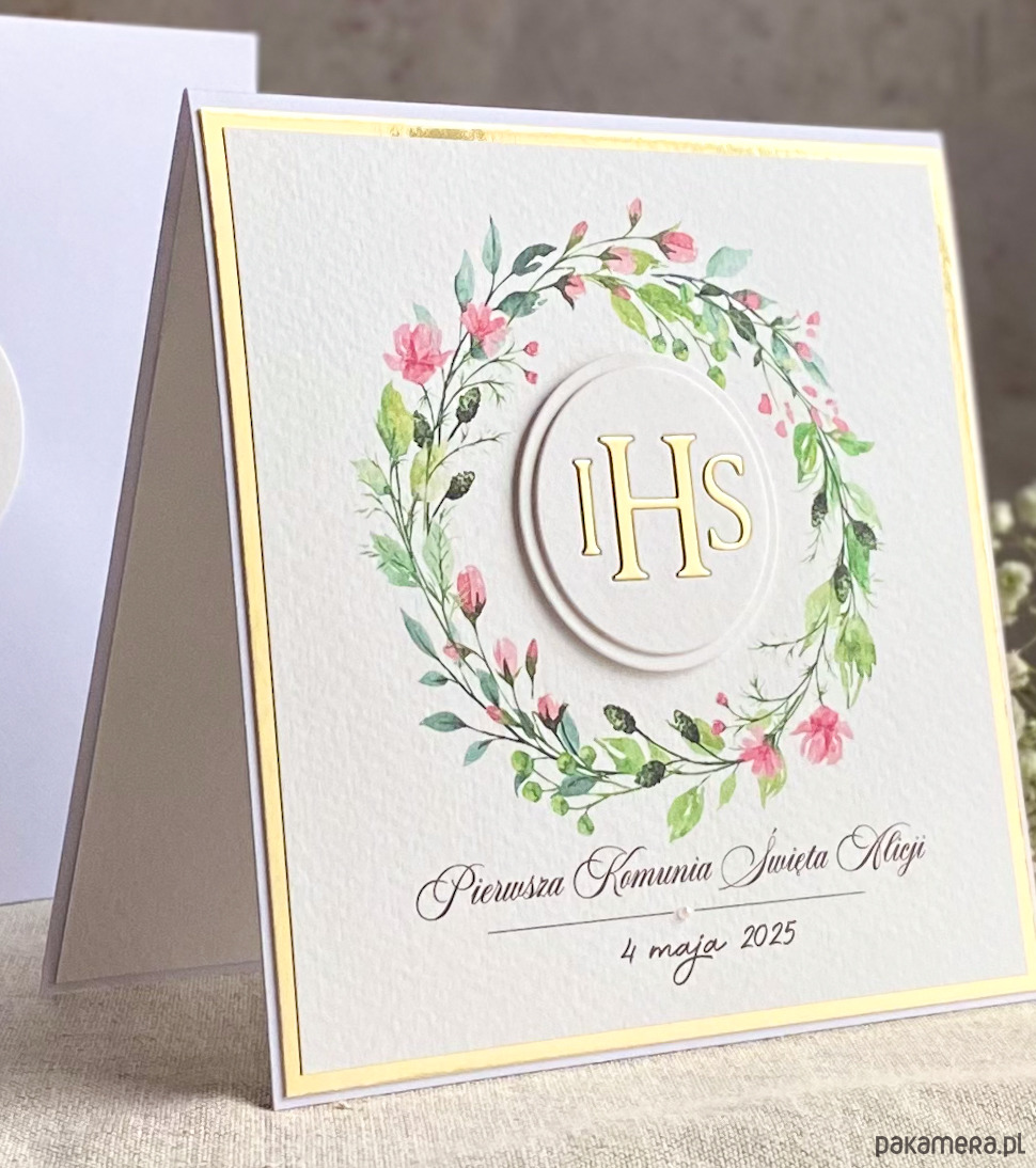 Pamiątka z delikatnym wiankiem graficznym i ręcznie wyciętą biało-złotą ozdobą. Zestaw z naszej autorskiej kolekcji - Linia GOLD.
