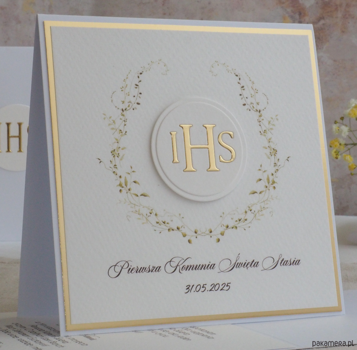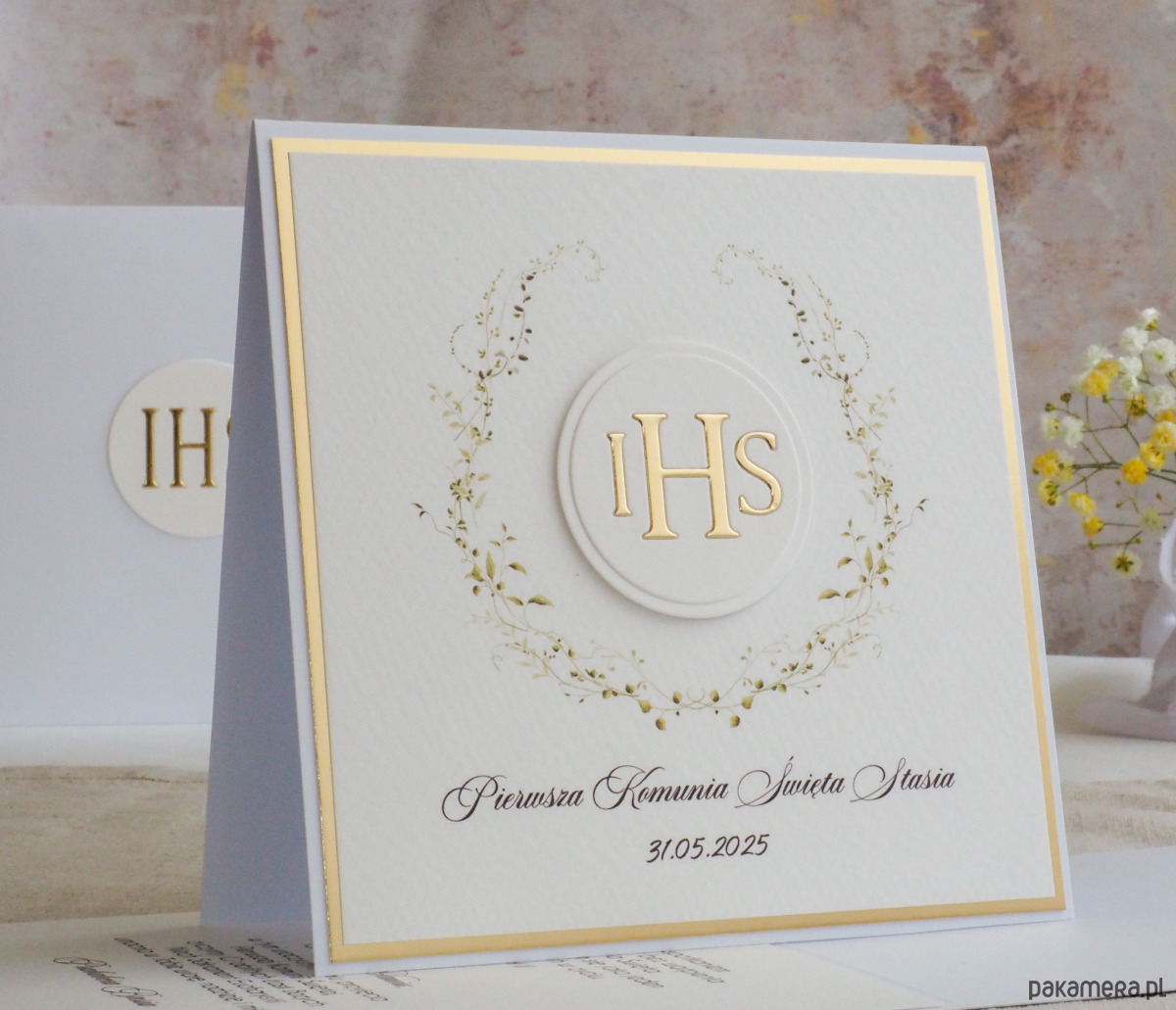 Pamiątka z delikatnym wiankiem graficznym i ręcznie wyciętą biało-złotą ozdobą. Zestaw z naszej autorskiej kolekcji - Linia GOLD.