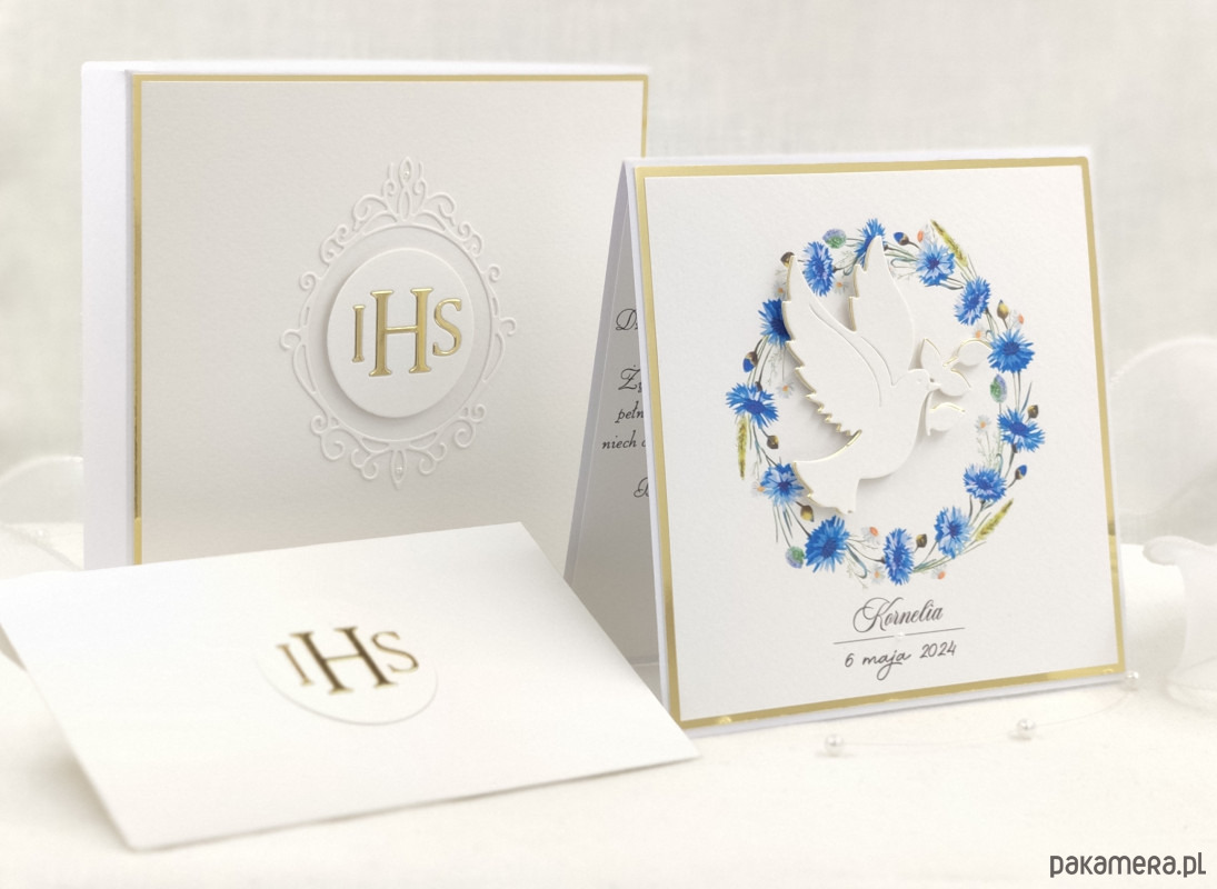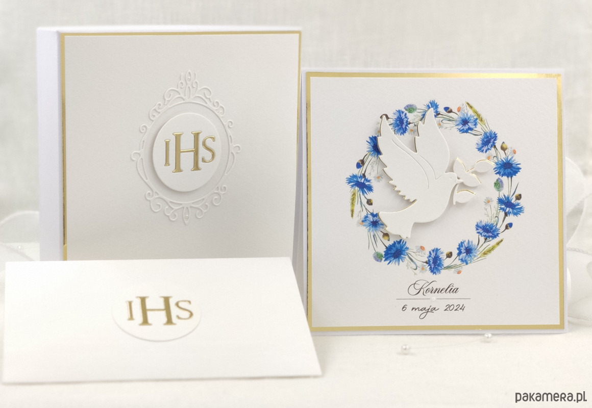 Pamiątka z delikatnym wiankiem graficznym i ręcznie wyciętą biało-złotą ozdobą. Zestaw z naszej autorskiej kolekcji - Linia Gold.