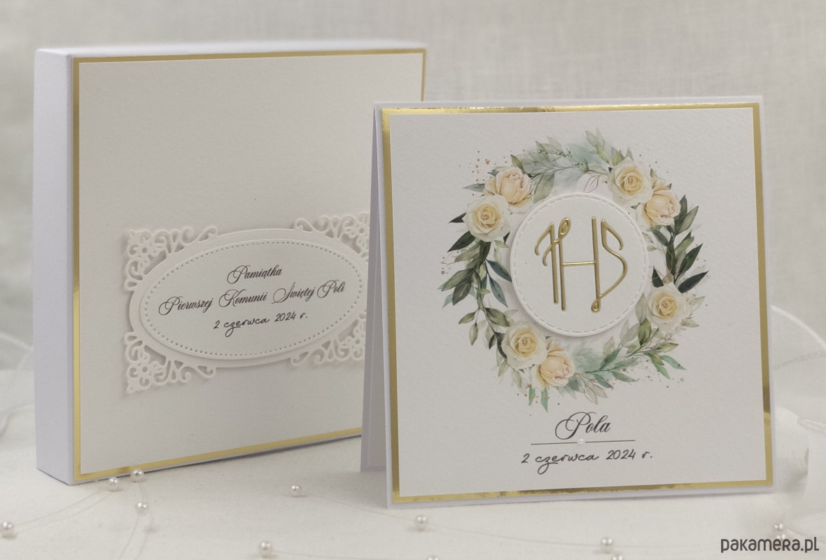 Delikatna i subtelna, ręcznie wykonana, personalizowana Pamiątka Pierwszej Komunii Świętej w pudełku z ozdobną kopertą na drobny upominek lub pieniądze.