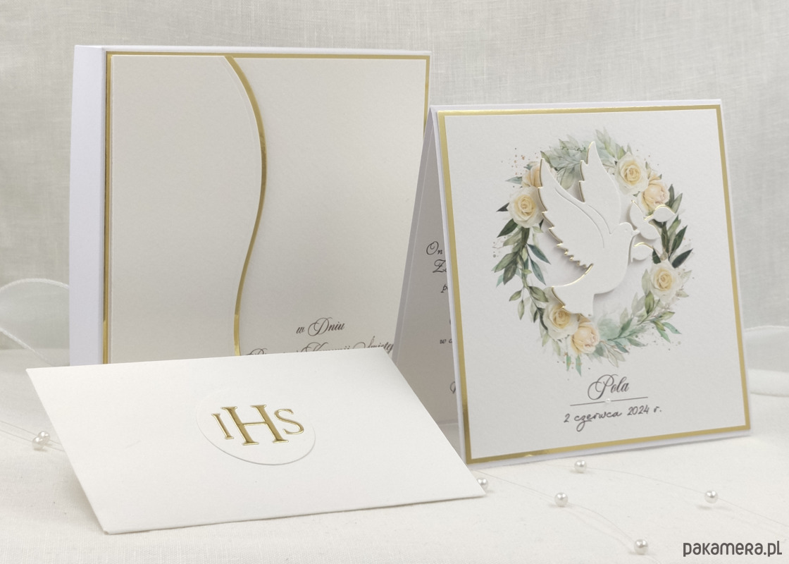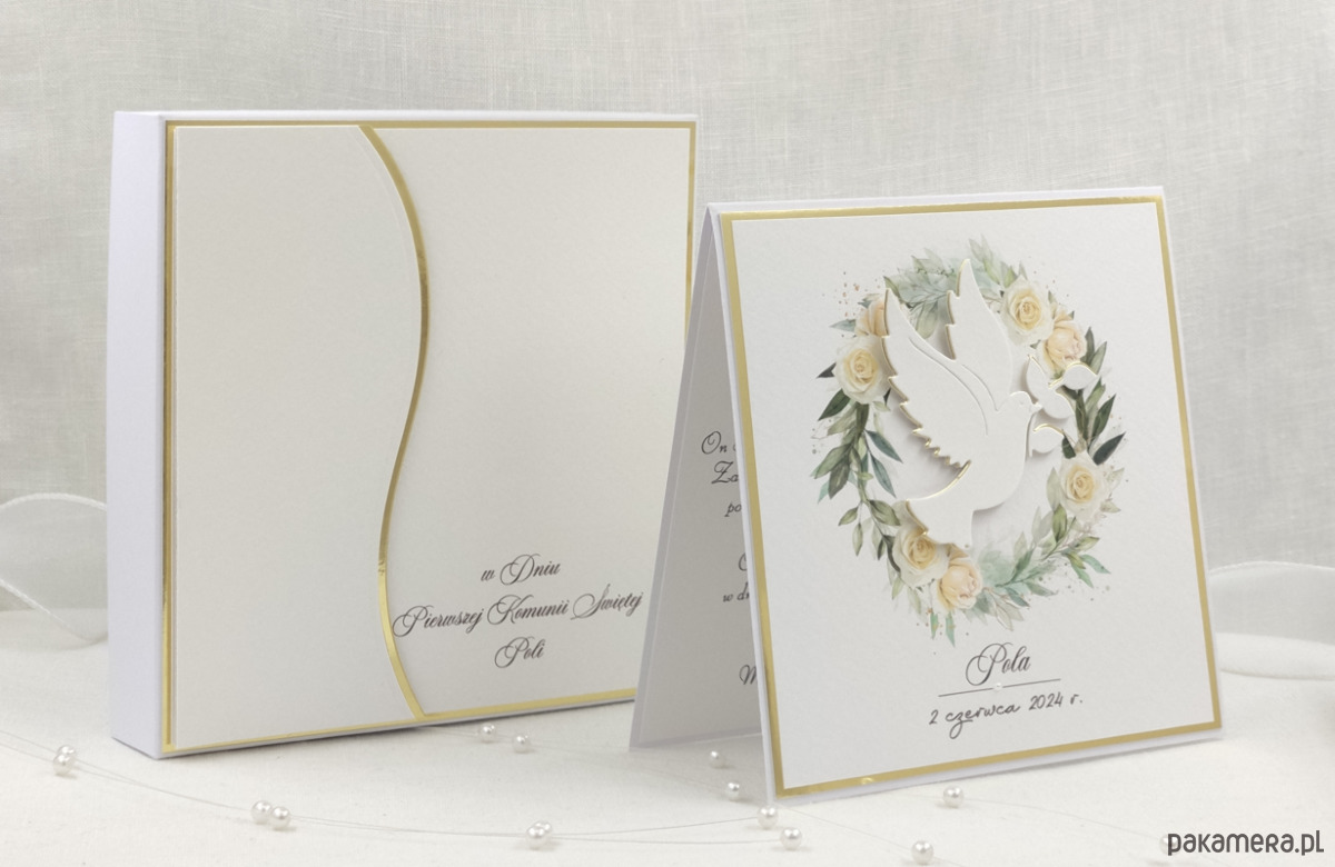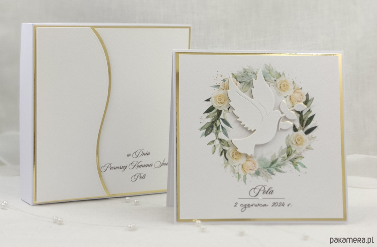 Pamiątka z delikatnym wiankiem graficznym i ręcznie wyciętą biało-złotą ozdobą. Zestaw z naszej autorskiej kolekcji - Linia Gold.
