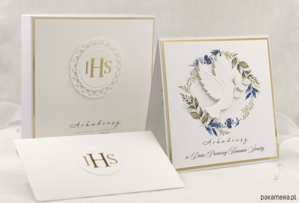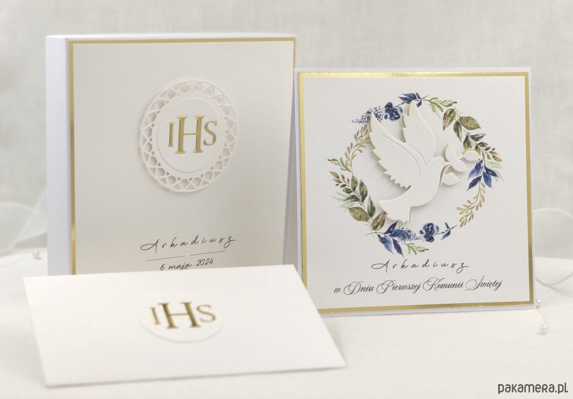 Pamiątka z delikatnym wiankiem graficznym i ręcznie wyciętą biało-złotą ozdobą. Zestaw z naszej autorskiej kolekcji - Linia Gold.