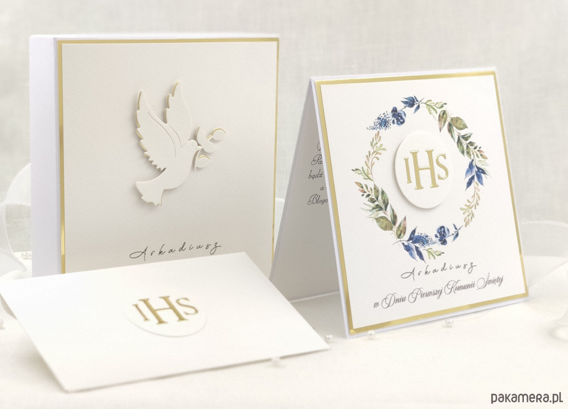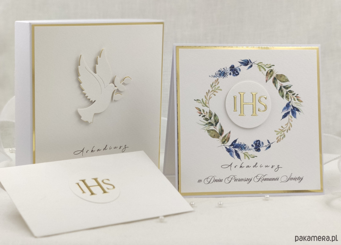 Pamiątka z delikatnym wiankiem graficznym i ręcznie wyciętą biało-złotą ozdobą.