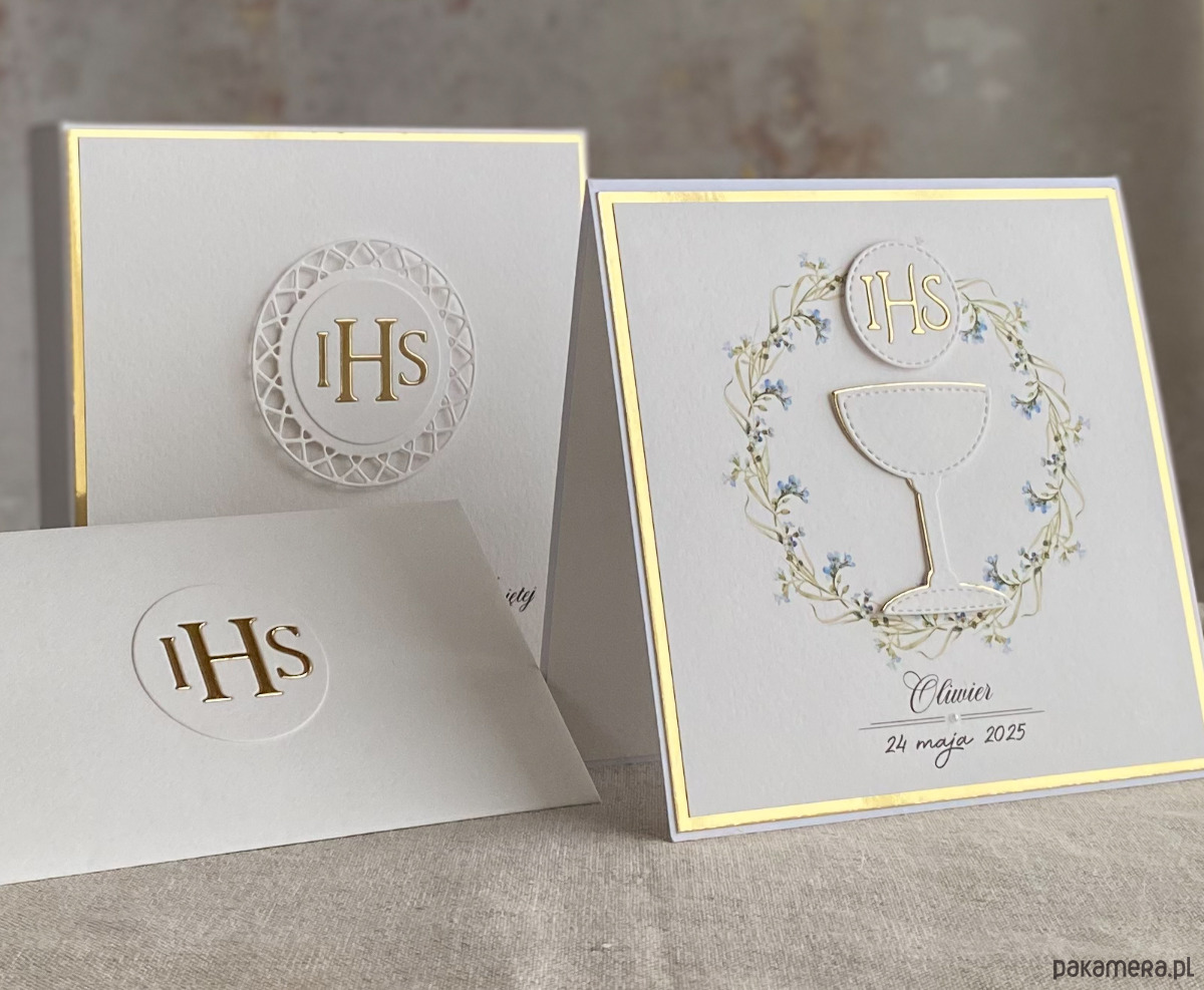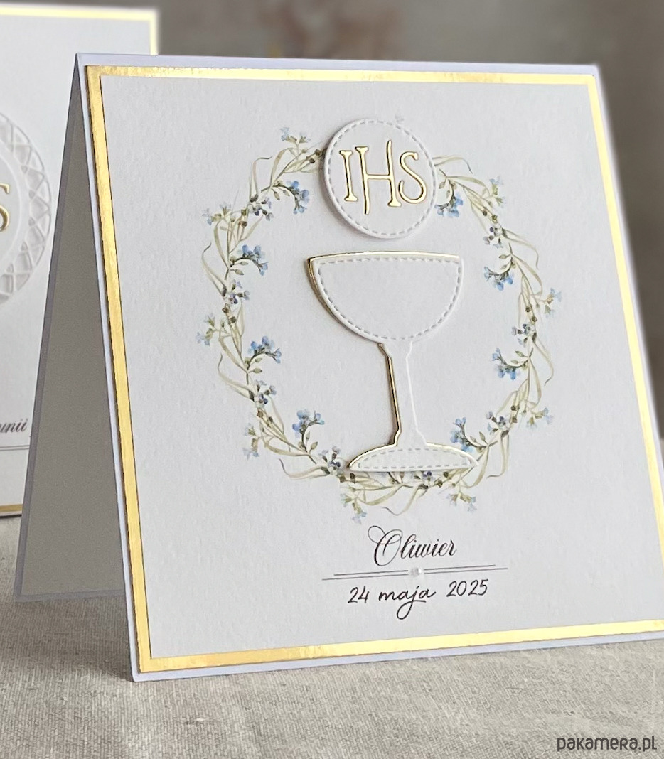 Pamiątka z delikatnym wiankiem graficznym i ręcznie wyciętą biało-złotą ozdobą. Zestaw z naszej autorskiej kolekcji - Linia Gold.