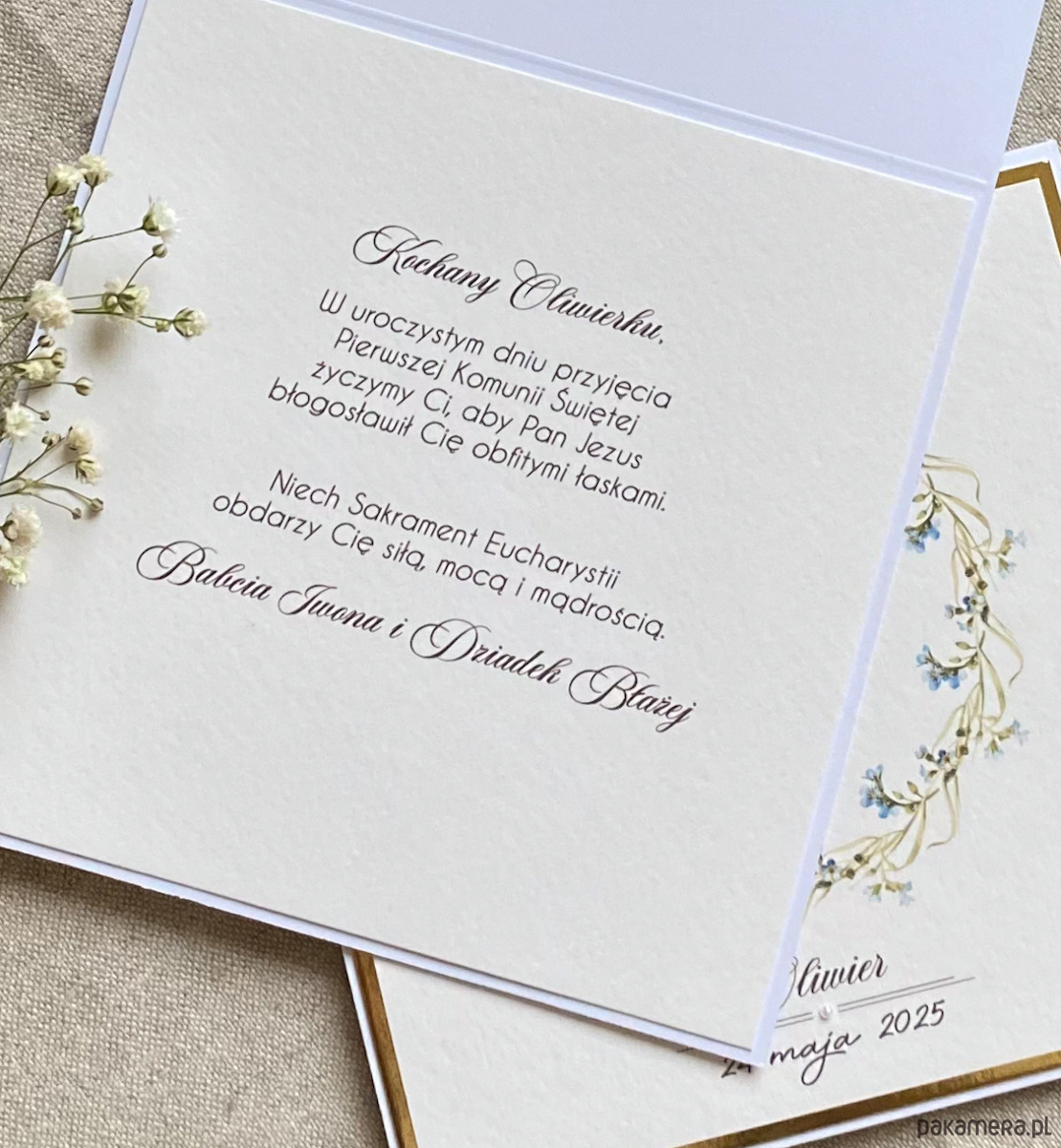 Pamiątka z delikatnym wiankiem graficznym i ręcznie wyciętą biało-złotą ozdobą. Zestaw z naszej autorskiej kolekcji - Linia Gold.