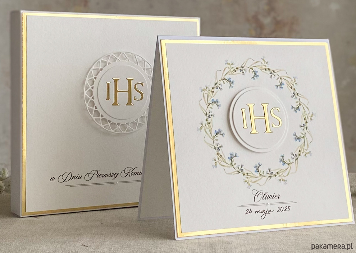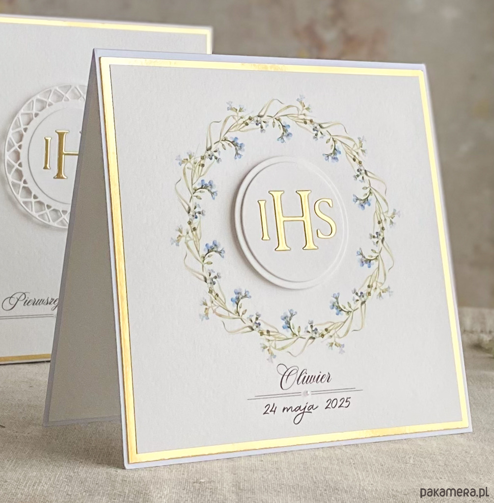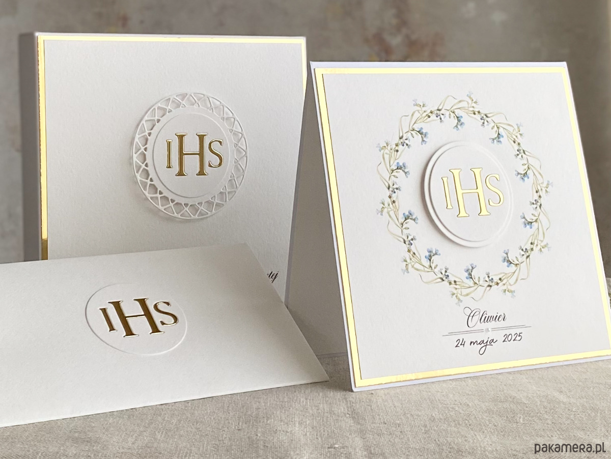 Pamiątka z delikatnym wiankiem graficznym i ręcznie wyciętą biało-złotą ozdobą. Zestaw z naszej autorskiej kolekcji - Linia Gold.