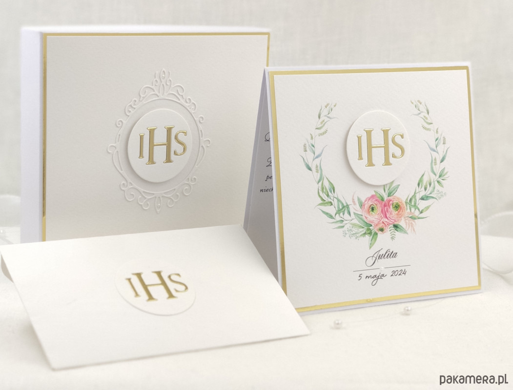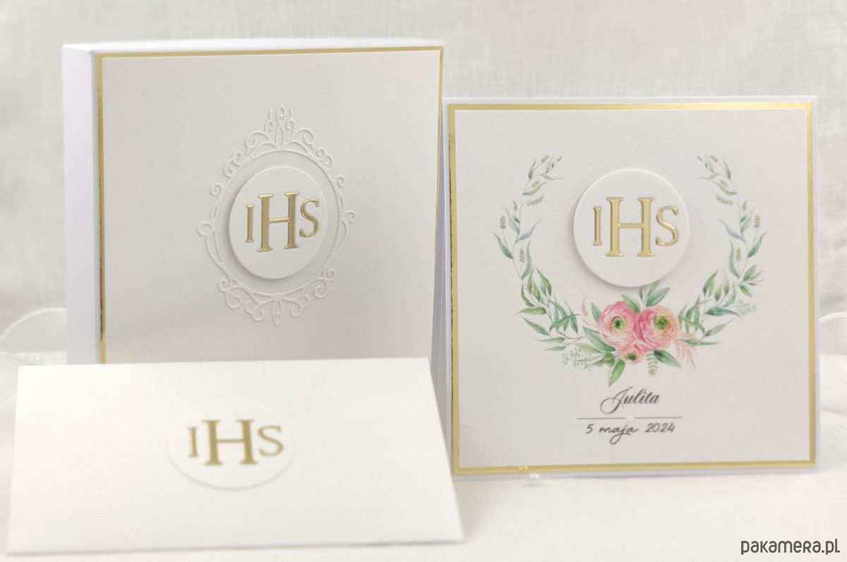 Pamiątka z delikatnym wiankiem graficznym i ręcznie wyciętą biało-złotą ozdobą. Zestaw z naszej autorskiej kolekcji - Linia Gold.