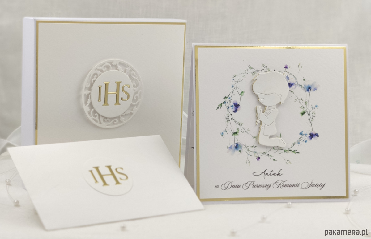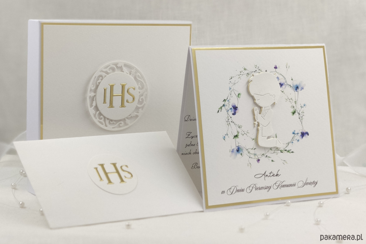 Pamiątka z delikatnym wiankiem graficznym i ręcznie wyciętą biało-złotą ozdobą. Zestaw z naszej autorskiej kolekcji - Linia Gold.