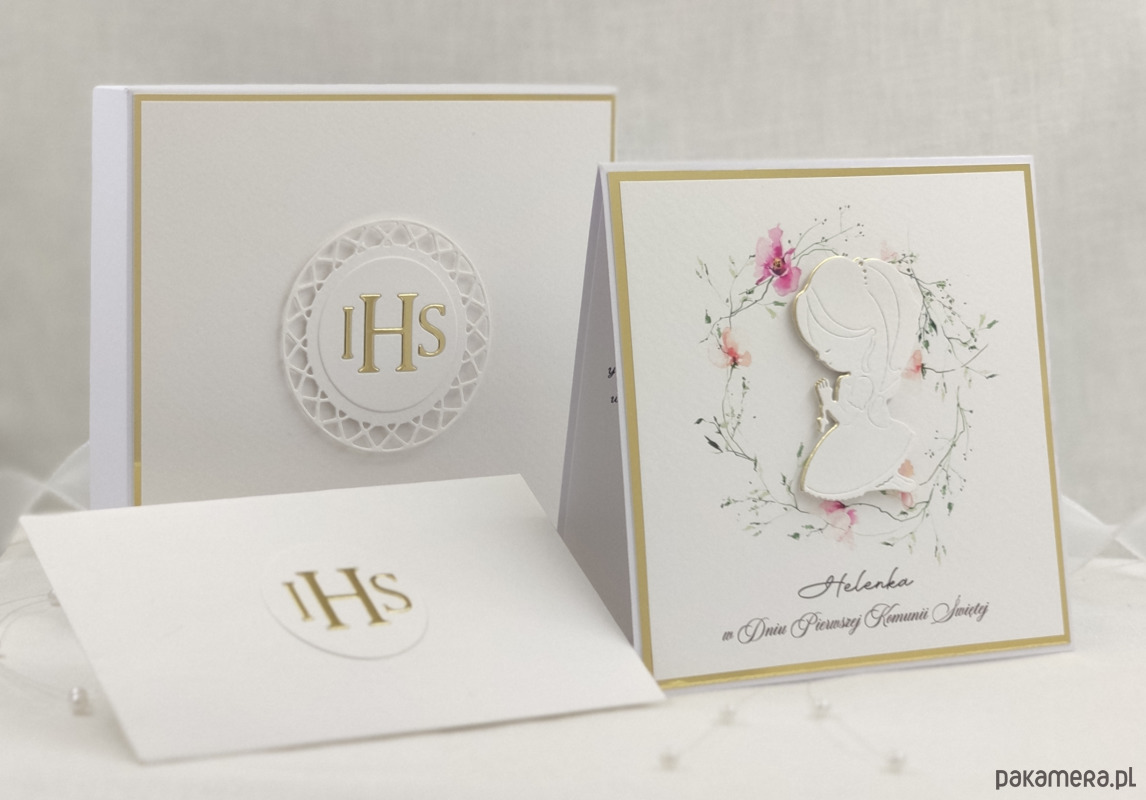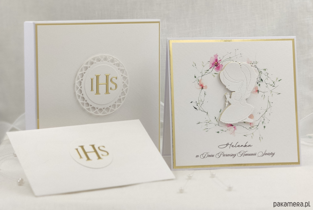 Pamiątka z delikatnym wiankiem graficznym i ręcznie wyciętą biało-złotą ozdobą. Zestaw z naszej autorskiej kolekcji - Linia Gold.