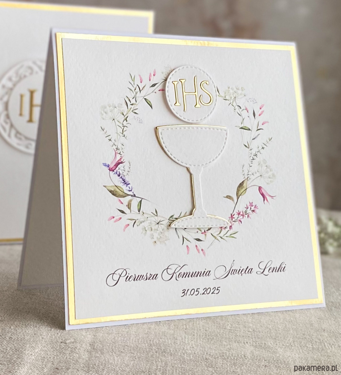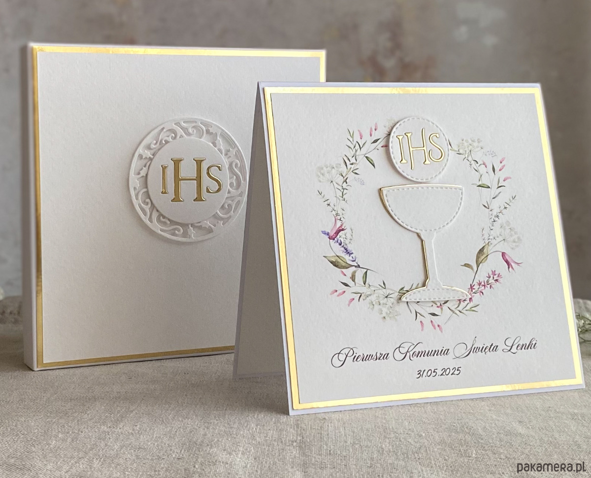 Pamiątka z delikatnym wiankiem graficznym i ręcznie wyciętą biało-złotą ozdobą. Zestaw z naszej autorskiej kolekcji - Linia Gold.