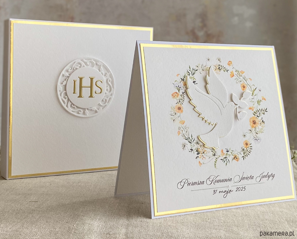 Pamiątka z delikatnym wiankiem graficznym i ręcznie wyciętą biało-złotą ozdobą. Zestaw z naszej autorskiej kolekcji - Linia Gold.