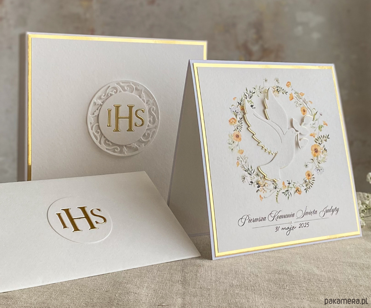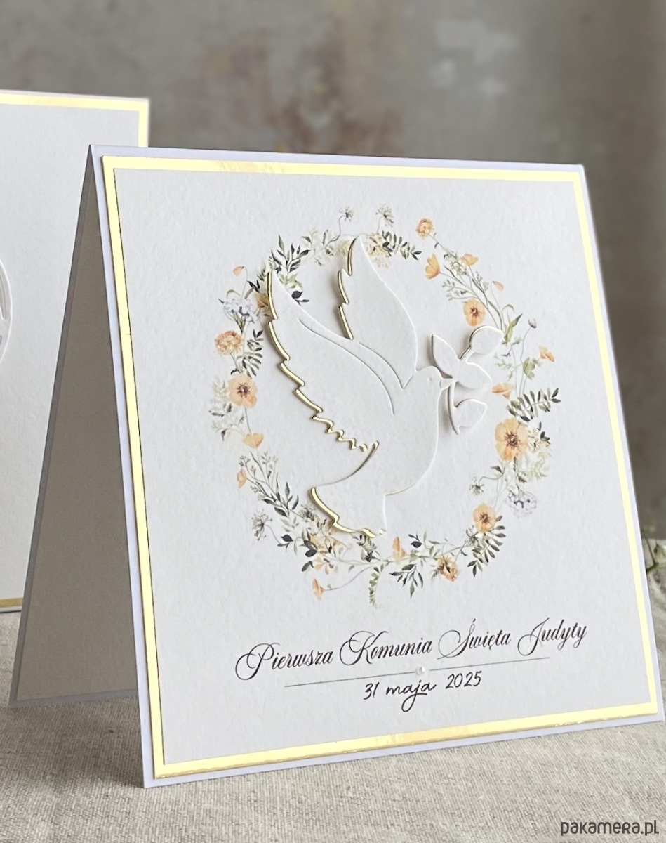 Pamiątka z delikatnym wiankiem graficznym i ręcznie wyciętą biało-złotą ozdobą. Zestaw z naszej autorskiej kolekcji - Linia Gold.