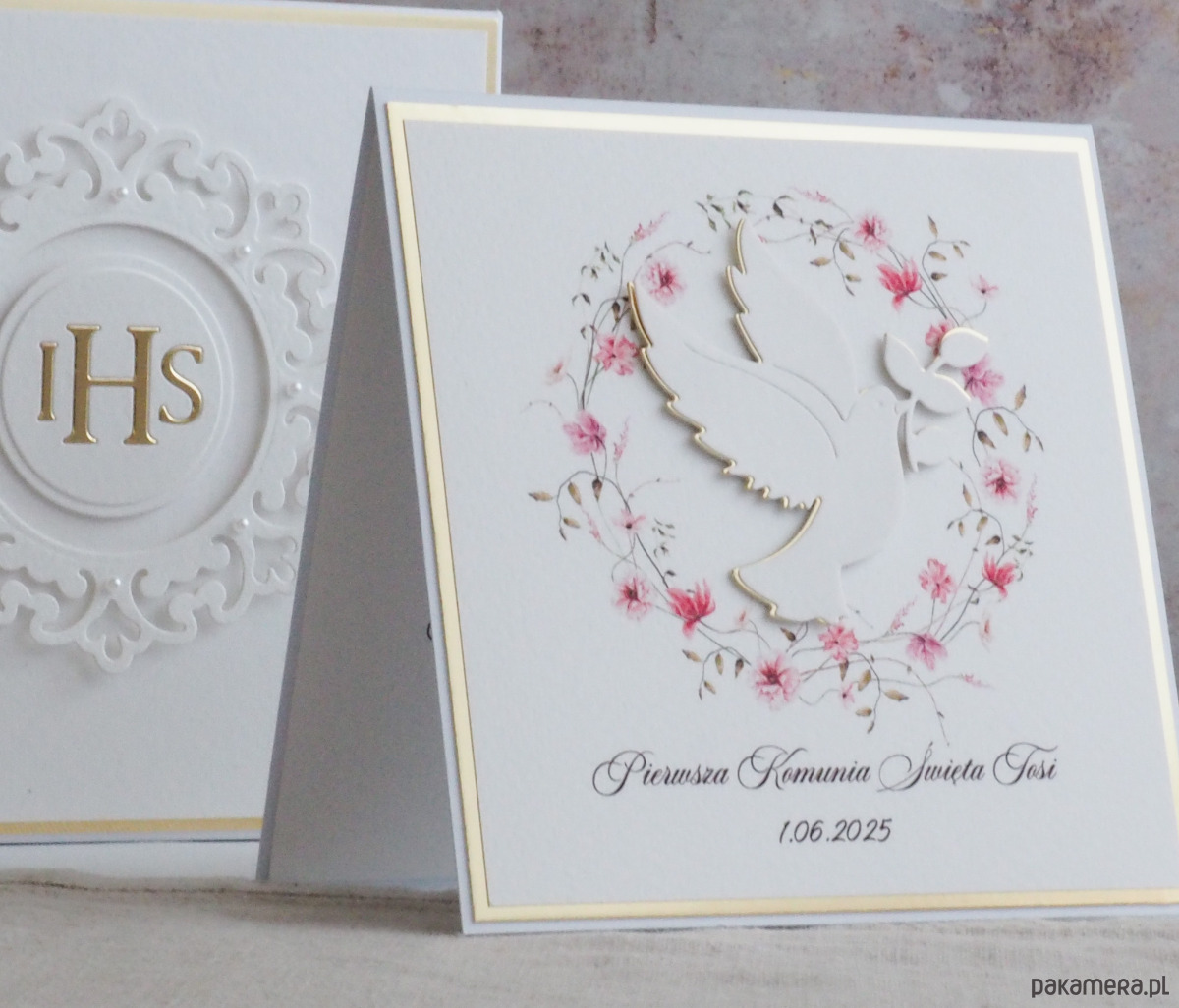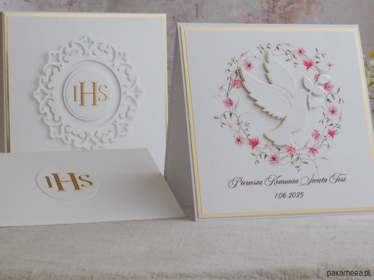 Pamiątka z delikatnym wiankiem graficznym i ręcznie wyciętą biało-złotą ozdobą. Zestaw z naszej autorskiej kolekcji - Linia Gold.
