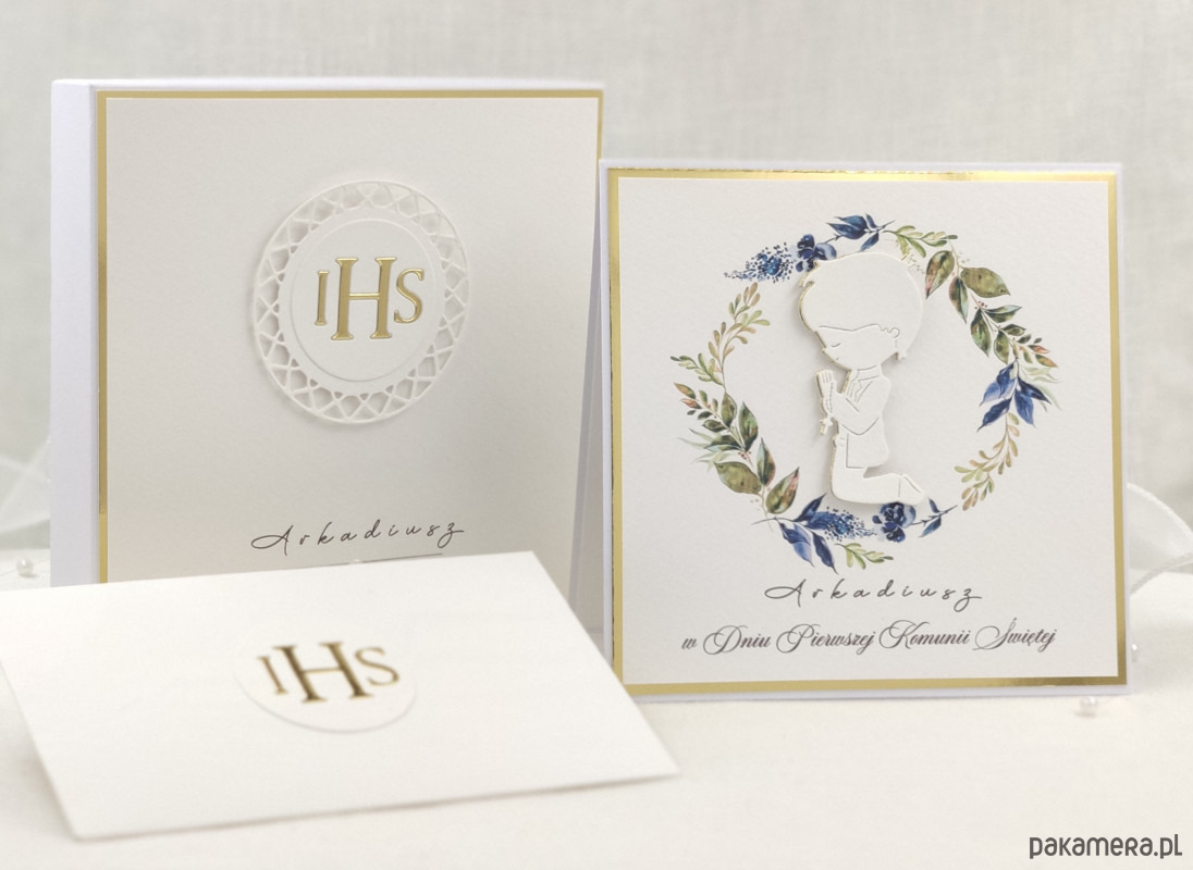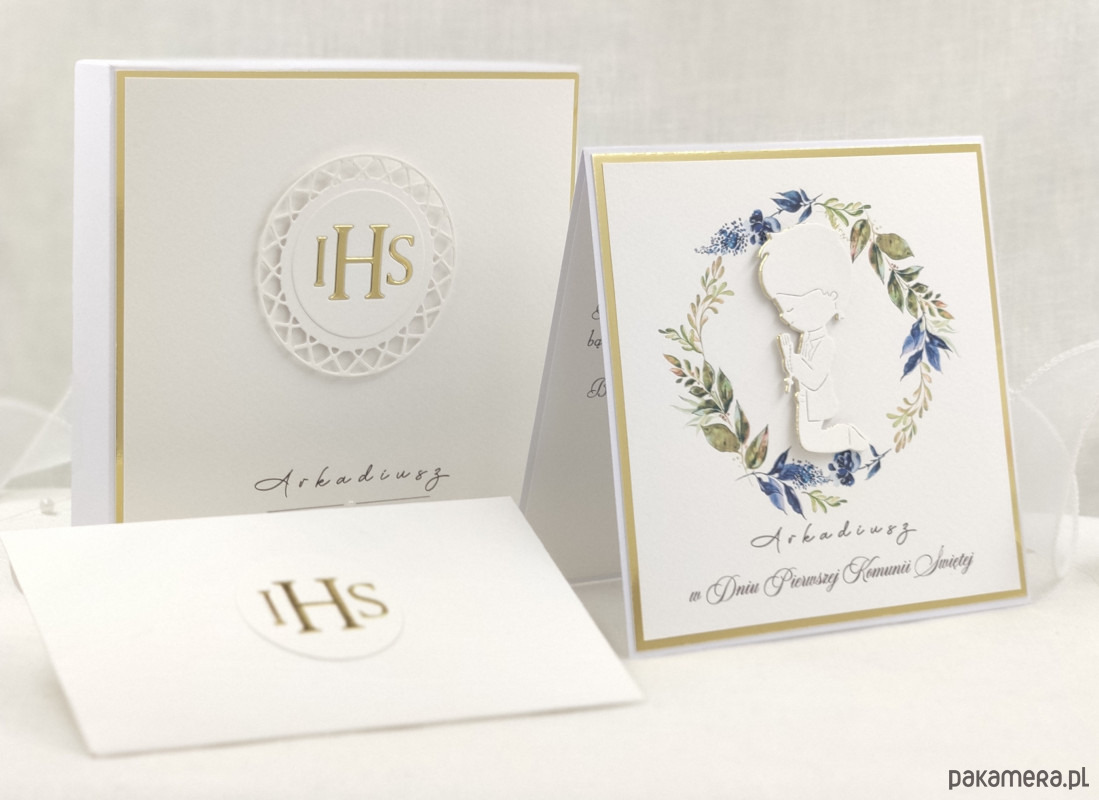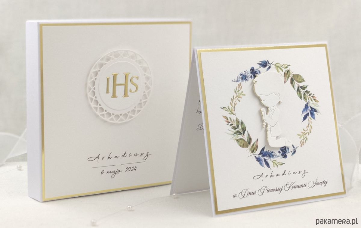 Pamiątka z delikatnym wiankiem graficznym i ręcznie wyciętą biało-złotą ozdobą. Zestaw z naszej autorskiej kolekcji - Linia Gold.