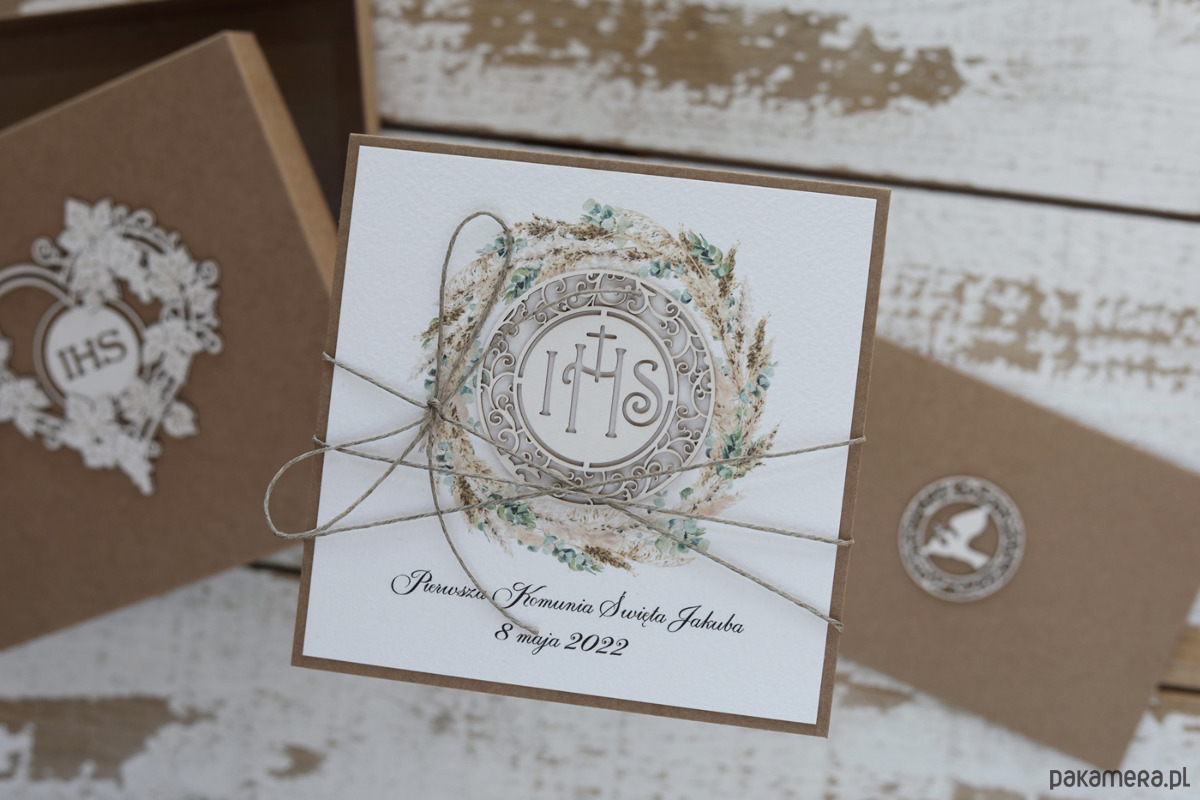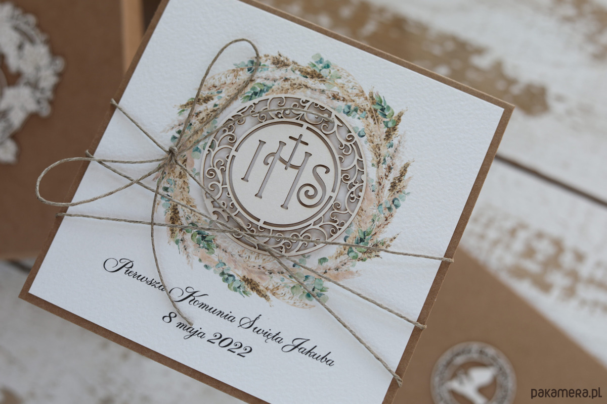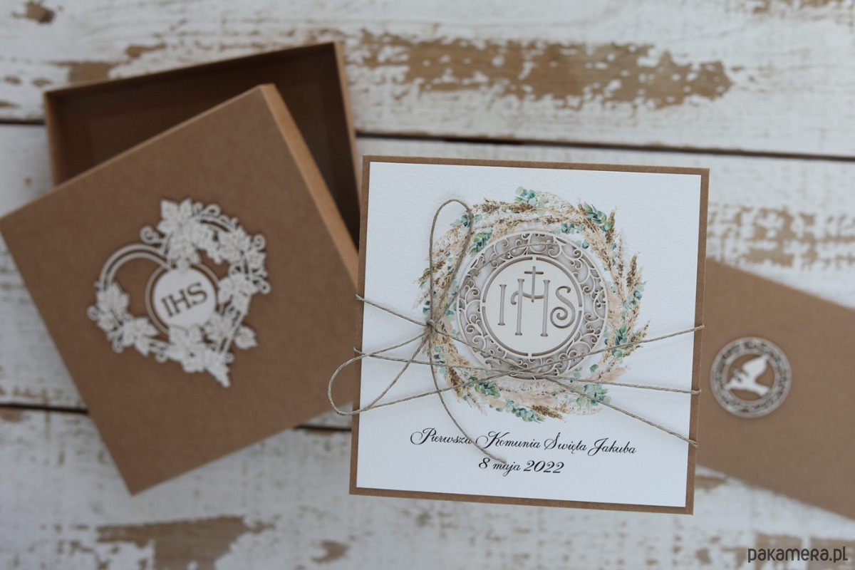 Przedmiotem oferty jest rustykalna kartka na komunię z pudełkiem i kopertą na pieniądze.