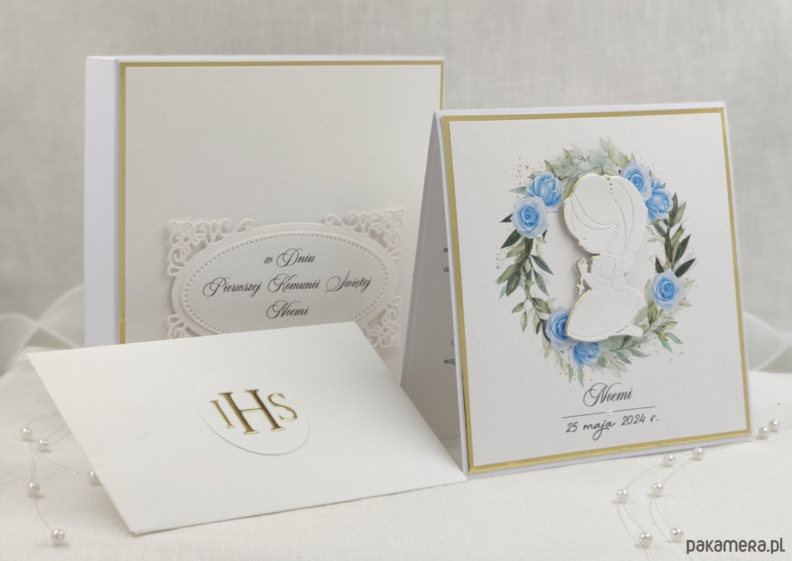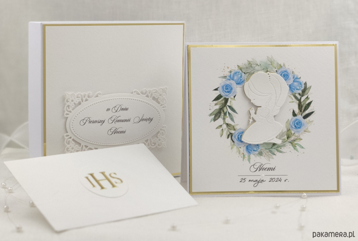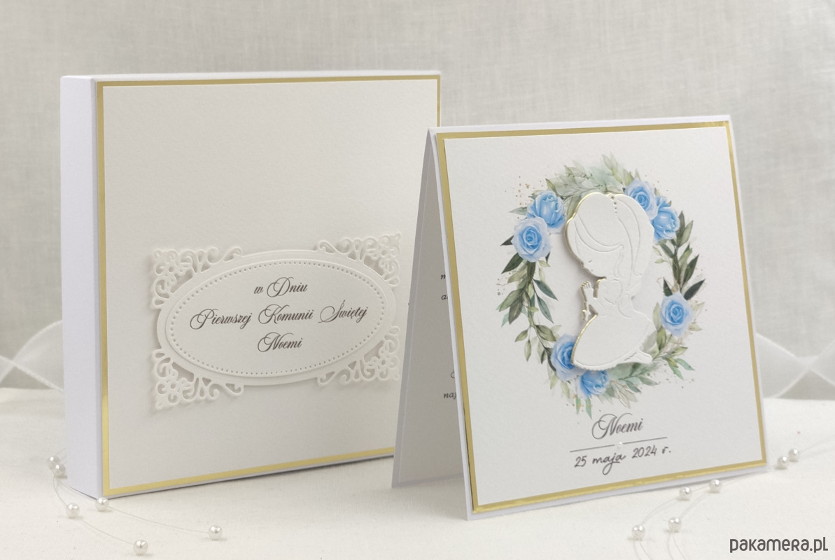Pamiątka z delikatnym wiankiem graficznym i ręcznie wyciętą biało-złotą ozdobą. Zestaw z wyjątkowej kolekcji - Linia Gold.